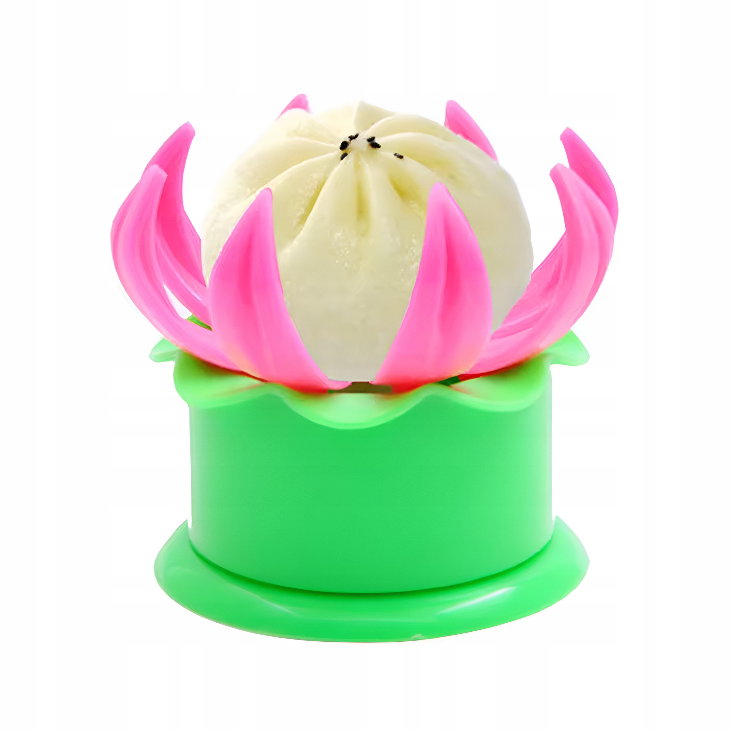 Форма для изготовления пельменей представляет собой красочный пластиковый инструмент, состоящий из двух частей. Нижняя часть зеленая, служит основанием и имеет форму круглой чашки. В верхней части светло-розовые лепестки», которые в сложенном виде образуют цветок. Это устройство используется для формирования пельменей, где лист теста помещается сверху, а начинка посередине, а затем листы закрываются, чтобы запечатать и придать пельменям форму. б> р>