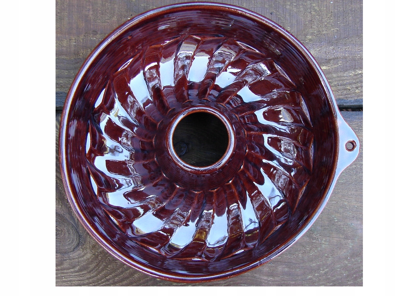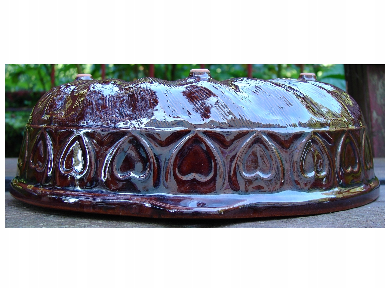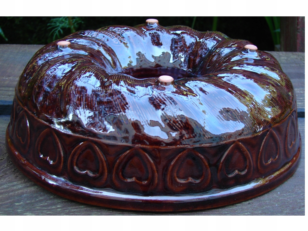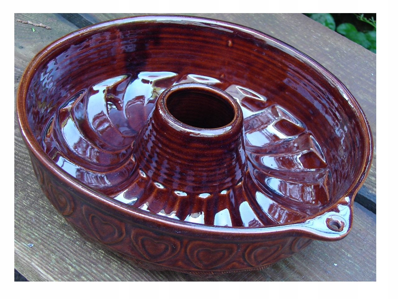 винтажная форма выпечки для выпечки бабушки, сделанная из глины, покрытой темно -коричневой эмалью.