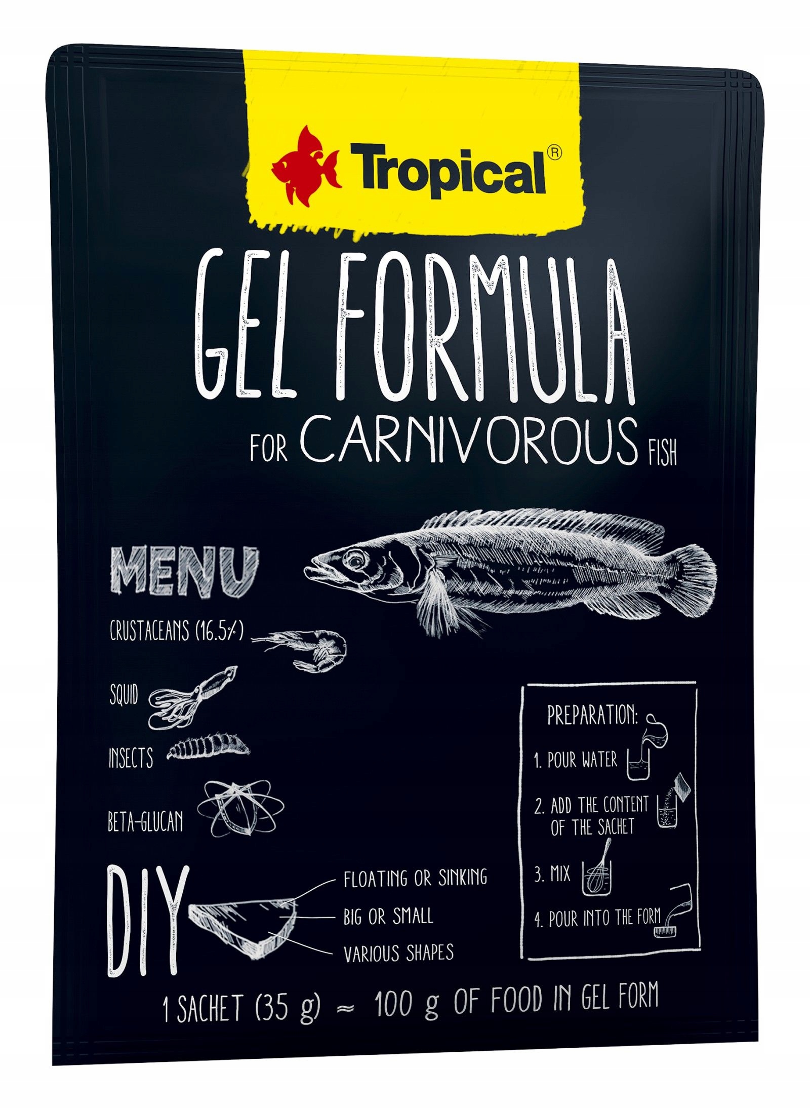 - Корм в виде желе для самостоятельного приготовления с повышенным содержанием беспозвоночных (24,2%), предназначенный для хищных и всеядных рыб.