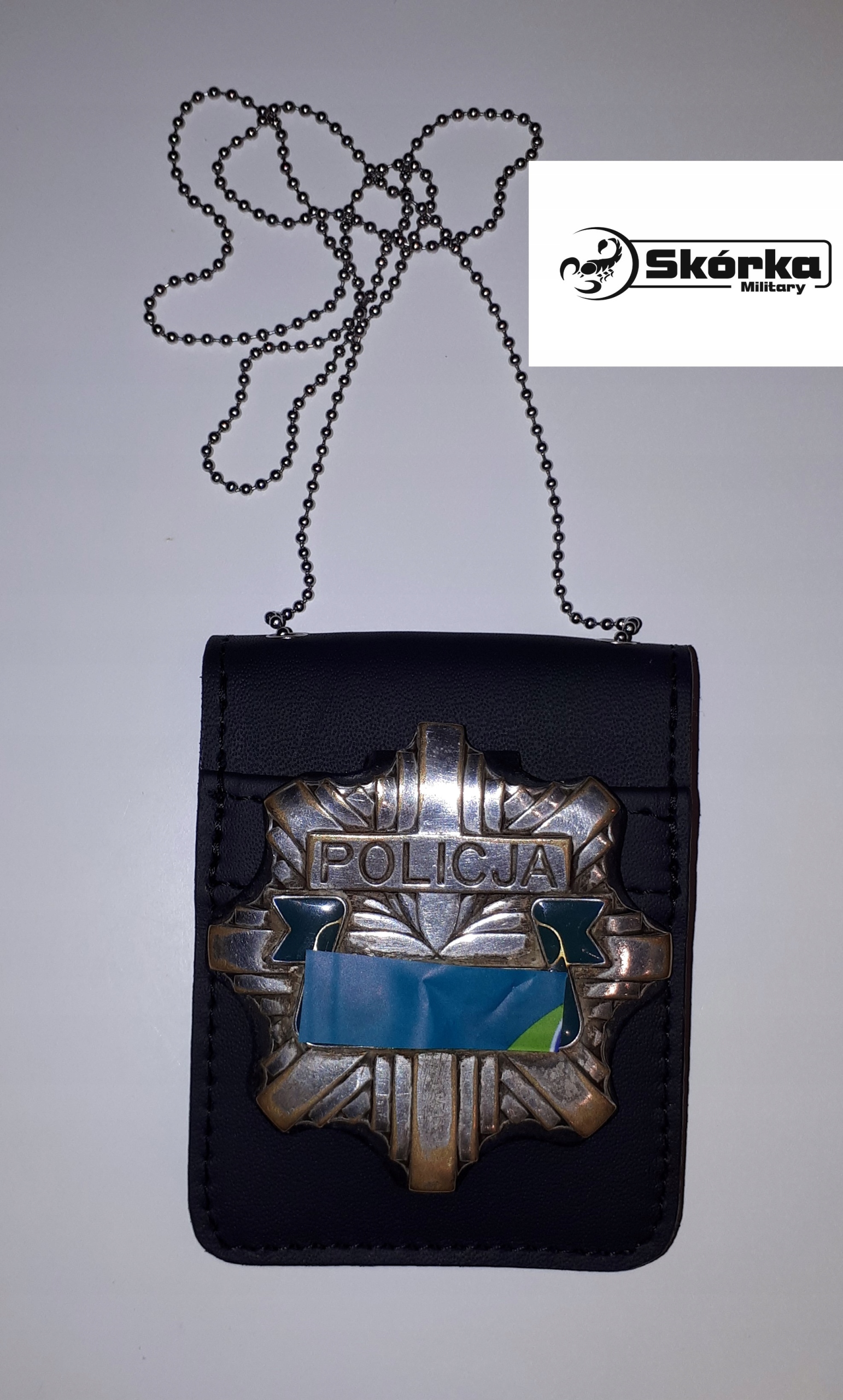 Чехол из высококачественной натуральной кожи, предназначенный для полицейского значка и удостоверения личности, для ношения на шее, закрывается на прочную застежку-липучку, имеет два внутренних кармана с экраном из силиконовой фольги шириной 8 см. х 9,5 см. и внешний карман размером 8 см. х 8см. с двумя отверстиями для крепления полицейского значка, отверстиями для цепочки с проушинами из нержавеющей стали. 4 мм. длина цепочки 80см. дополнительно цепной замок, защищенный от случайного расстегивания термоусадочной втулкой, размеры в сложенном виде: 8 см. х 11см..