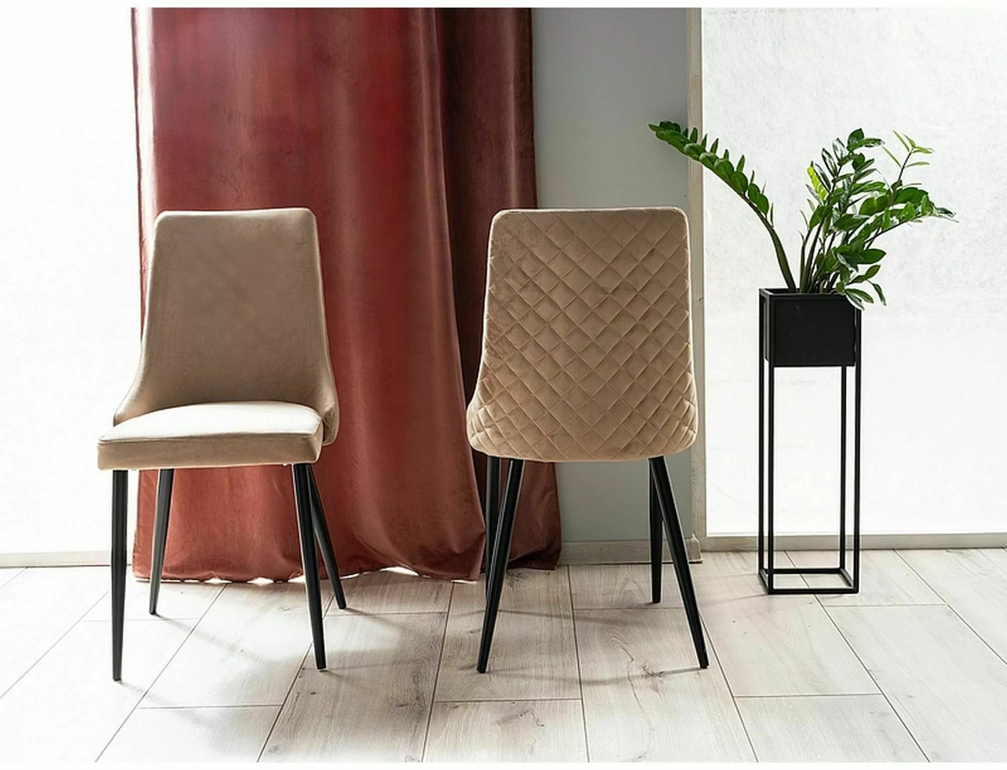 Стул, бархатная ткань: Bluvel 28 - бежевый, рама: металл, цвет: черный коврик. Задняя часть спинки имеет декоративное стеганое одеяло в бриллиантах.