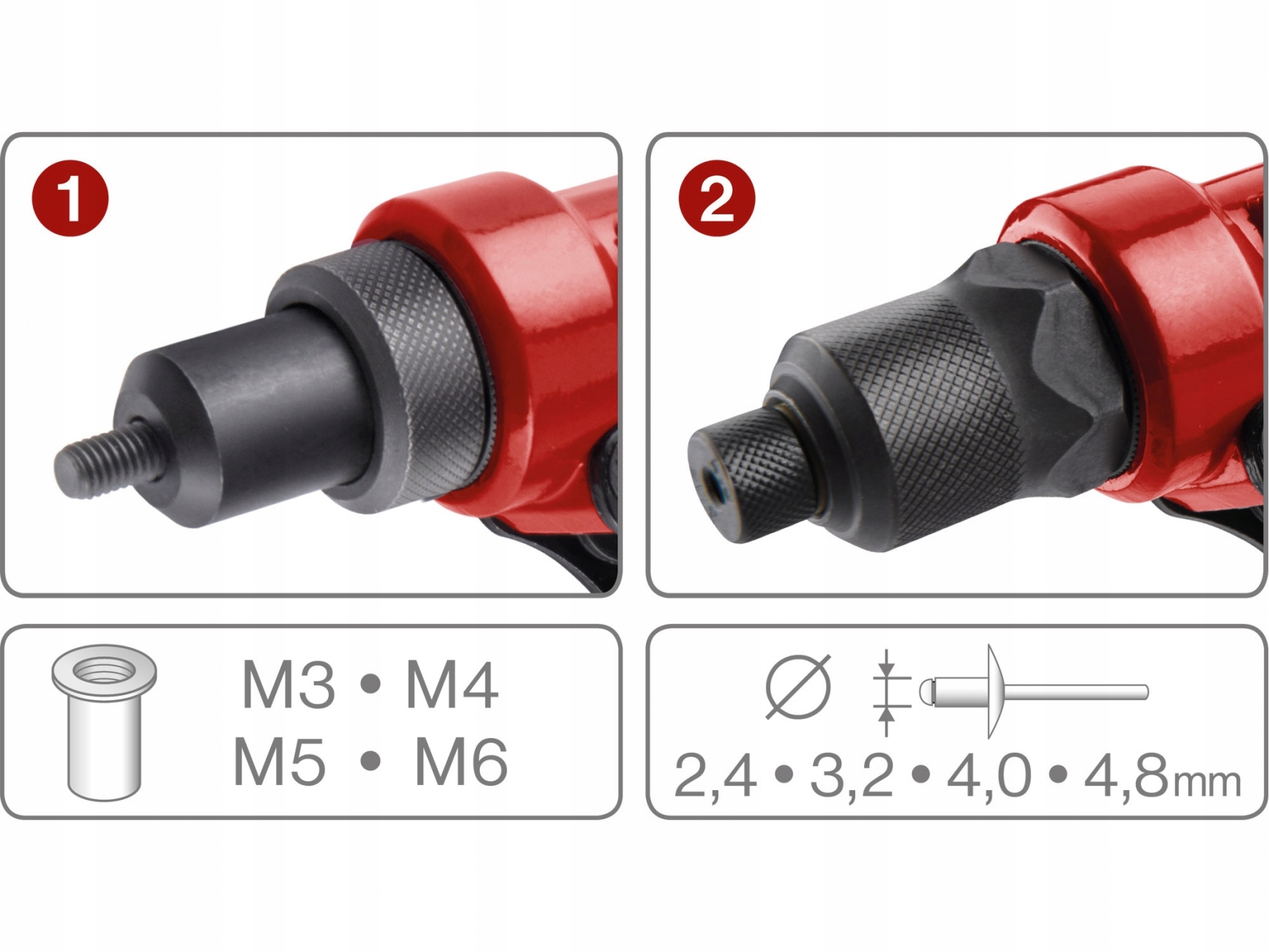 Дополнительный параметр: 260 мм, M3-M4-M5-M6 Niterbarums и проладкие заклепки 2.4-3.2-4,0-4,8 мм, изготовленные из Al, латунь, сталь, нержавеющая сталь