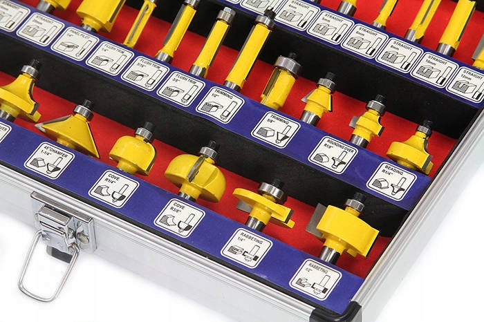 Выбранные фрезы имеют подшипники. которые уменьшают трение и очень твердое лезвие из быстрорежущей стали HSS. Набор фрез находится в профессиональном чемоданчике, у каждой фрезы свое подписанное место. Незаменимый набор для каждой столярной мастерской и не только.