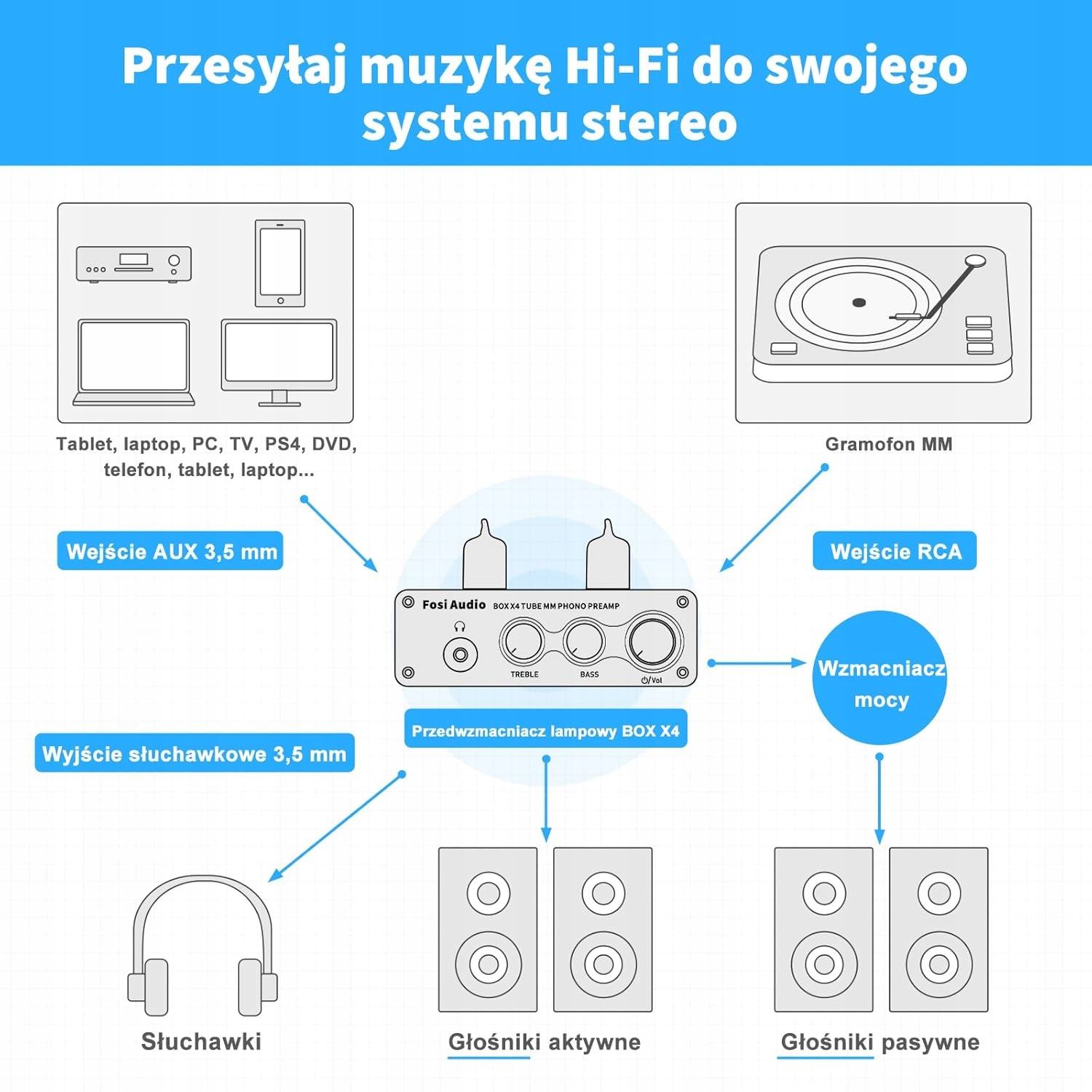 Ламповый усилитель Fosi Audio HiFi BOX X4, фонокорректор 5725 Вт