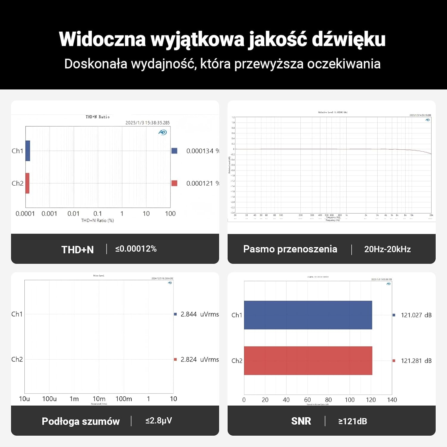 Обеспечивает впечатляющее соотношение сигнал/шум 121 дБ, чрезвычайно низкий уровень искажений 0,00012% и исключительный динамический диапазон 121 дБ. Соответствует более дорогим ЦАП или превосходит их по качеству звука аудиофильского уровня.