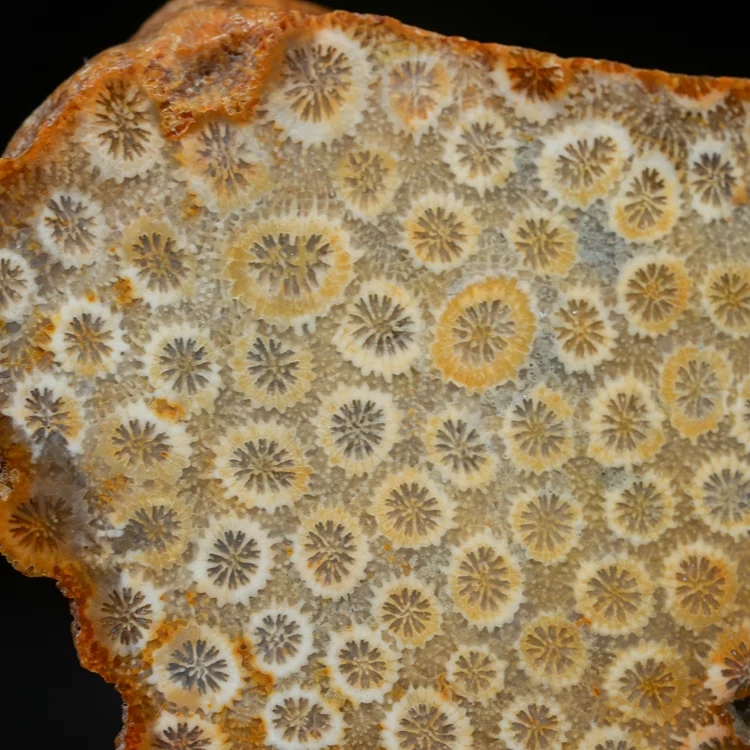 Коралл тщательно отполирован, что подчеркивает детали его структуры и придает поверхности гладкий и зеркальный блеск. Благодаря этому видны естественные узоры, напоминающие розетки, характерные для окаменевших кораллов мадрепор.