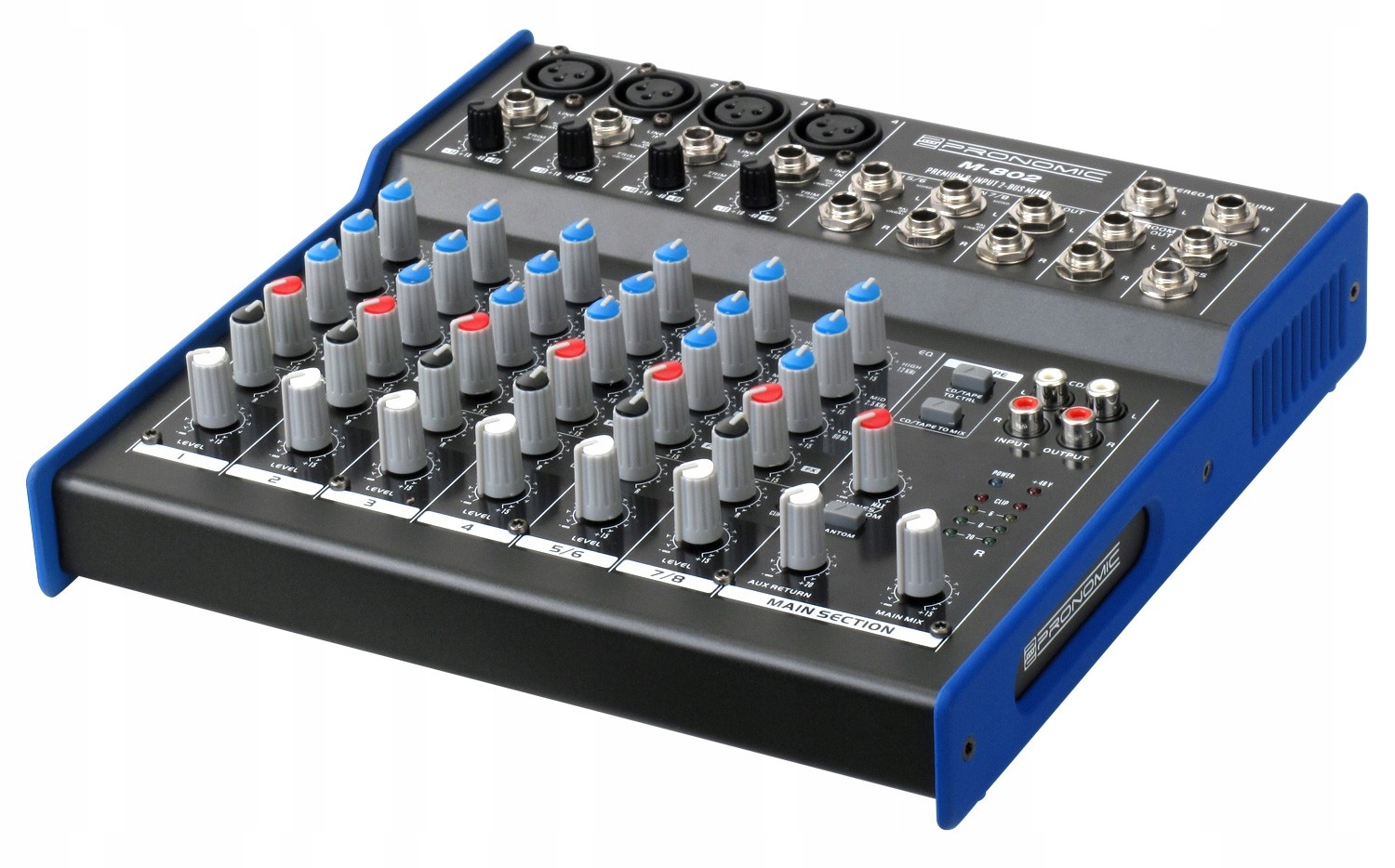 Микшер с 8 каналами, 4 моно с разъемами XLR и Jack 6.3 и 2 стерео с балансным разъемом Jack 6.3. Есть 3-х полосный эквалайзер (НЧ 80Гц/Средние 2,5КГц/ВЧ 12КГц) на всех каналах, выход на наушники, но есть возможность использовать и внешний блок благодаря оборудованию разъемов FX Send и Stereo Aux Return.