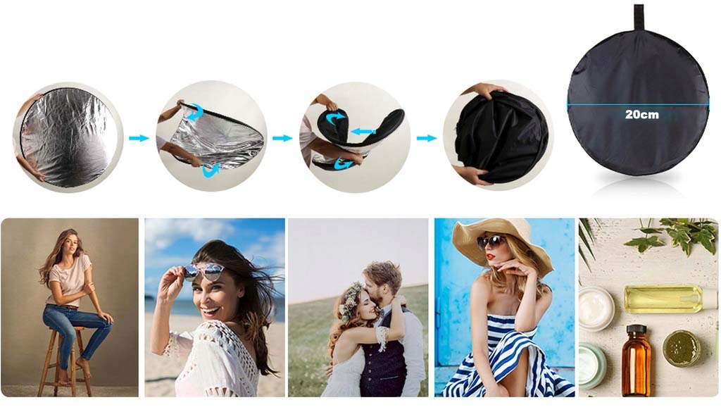 Фотография используется для отражения света и изменения его цвета. Он используется как во время полевых фотографий при дневном свете, так и в фотостудии. Благодаря смеси, вы можете управлять светом в раме и соответствующим образом осветить сфотографированный объект даже с дефицитом дневного света или недостатков освещения. Включает смесь с пятью типами поверхностей.