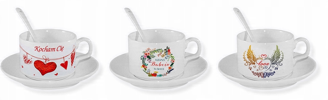 Чашка с принтом, ложка и тарелка
