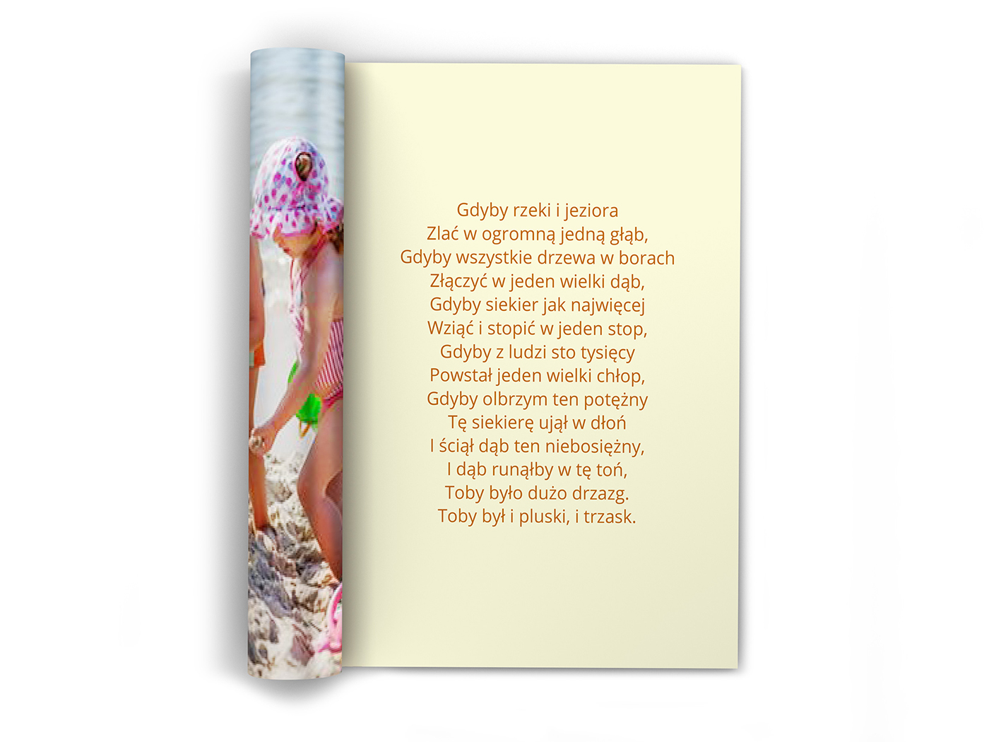Этот дизайн хорошо подходит, если мы хотим разместить на странице много фотографий и текст под ними. Фотографии расположены в столбцах. Каждый столбец имеет одинаковую ширину, но может иметь разную высоту. Нижняя часть открытки предназначена для текста. Если на странице всего одна фотография, размером примерно с открытку, она размещается на всей странице. Если на левой странице есть одна очень широкая фотография, а на правой нет ни одной, фотография размещается на обоих листах бумаги.