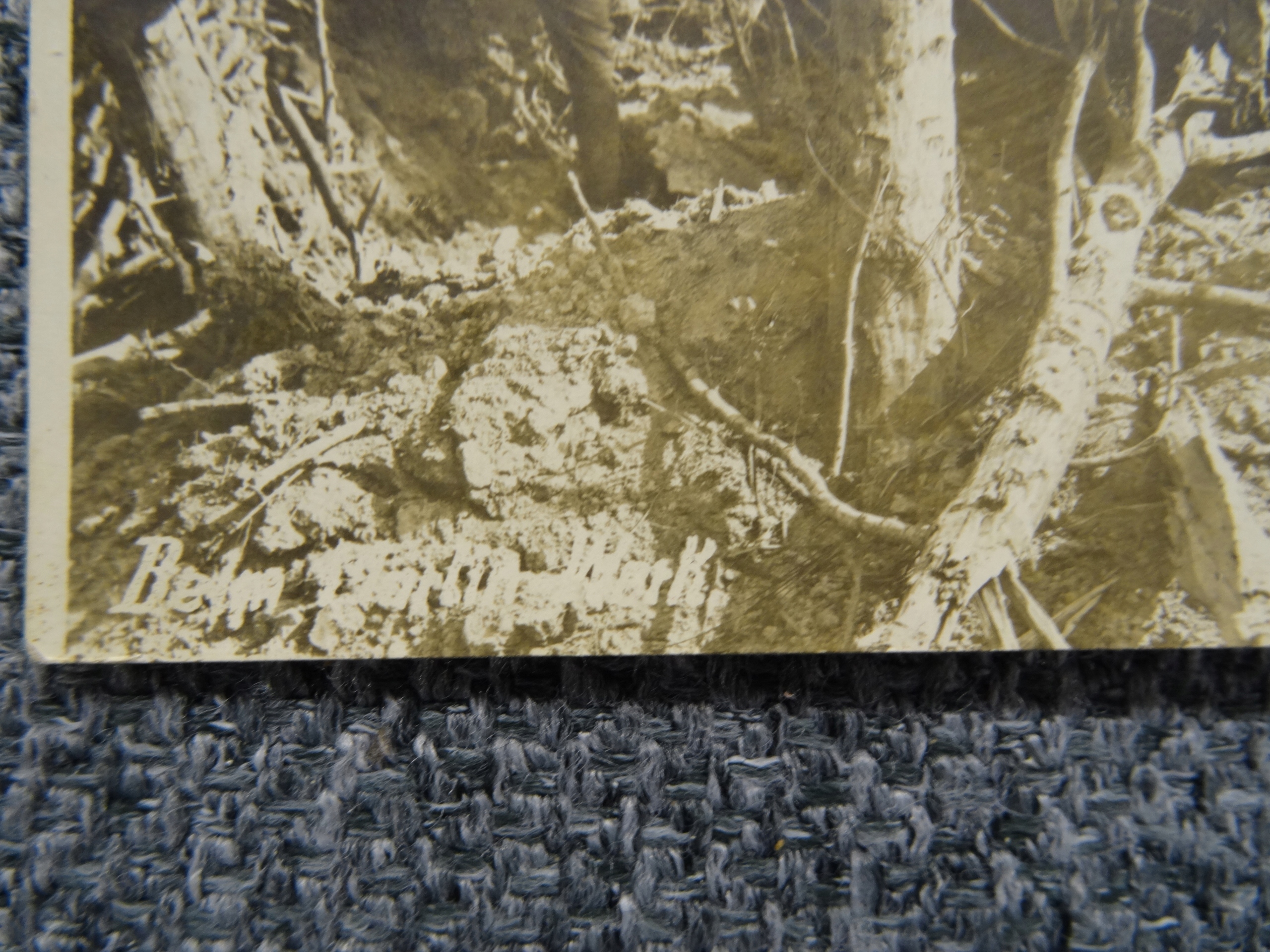 Фотооткрытка - разбомбленные прусские окопы, на дереве висит уцелевшая фляга, 1915 год.