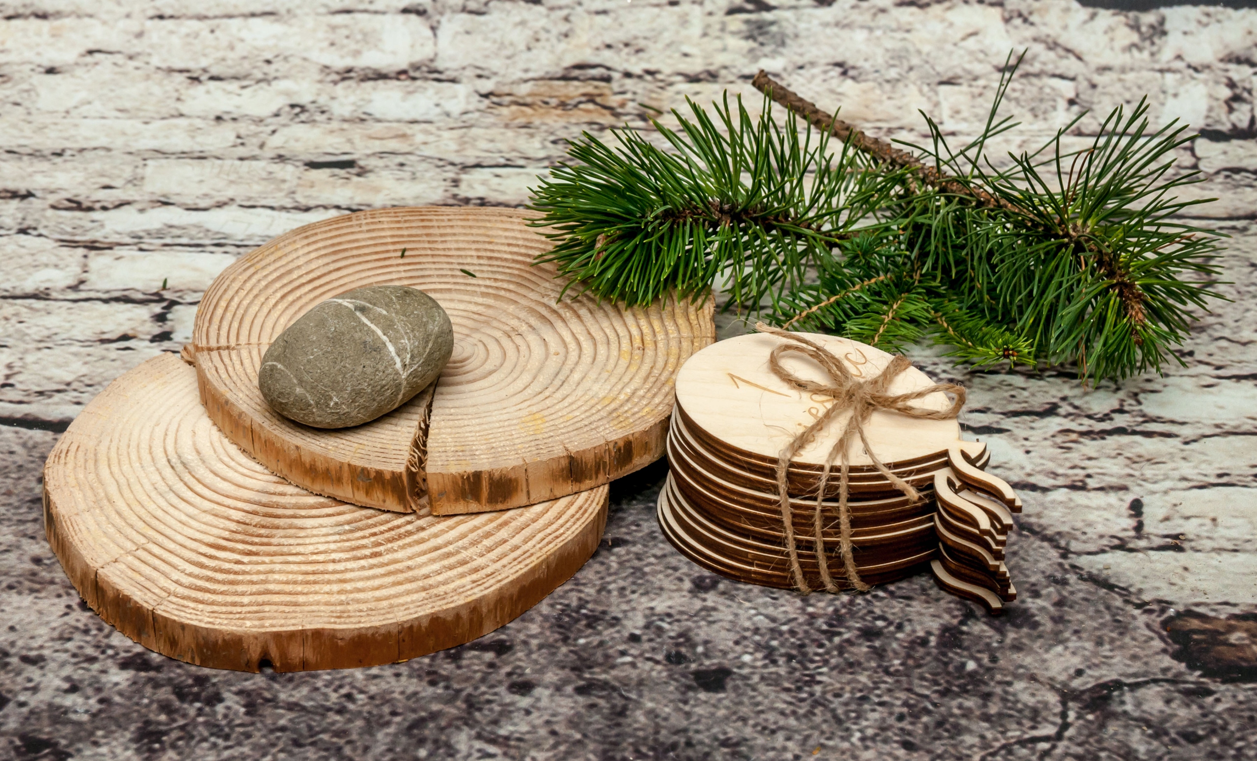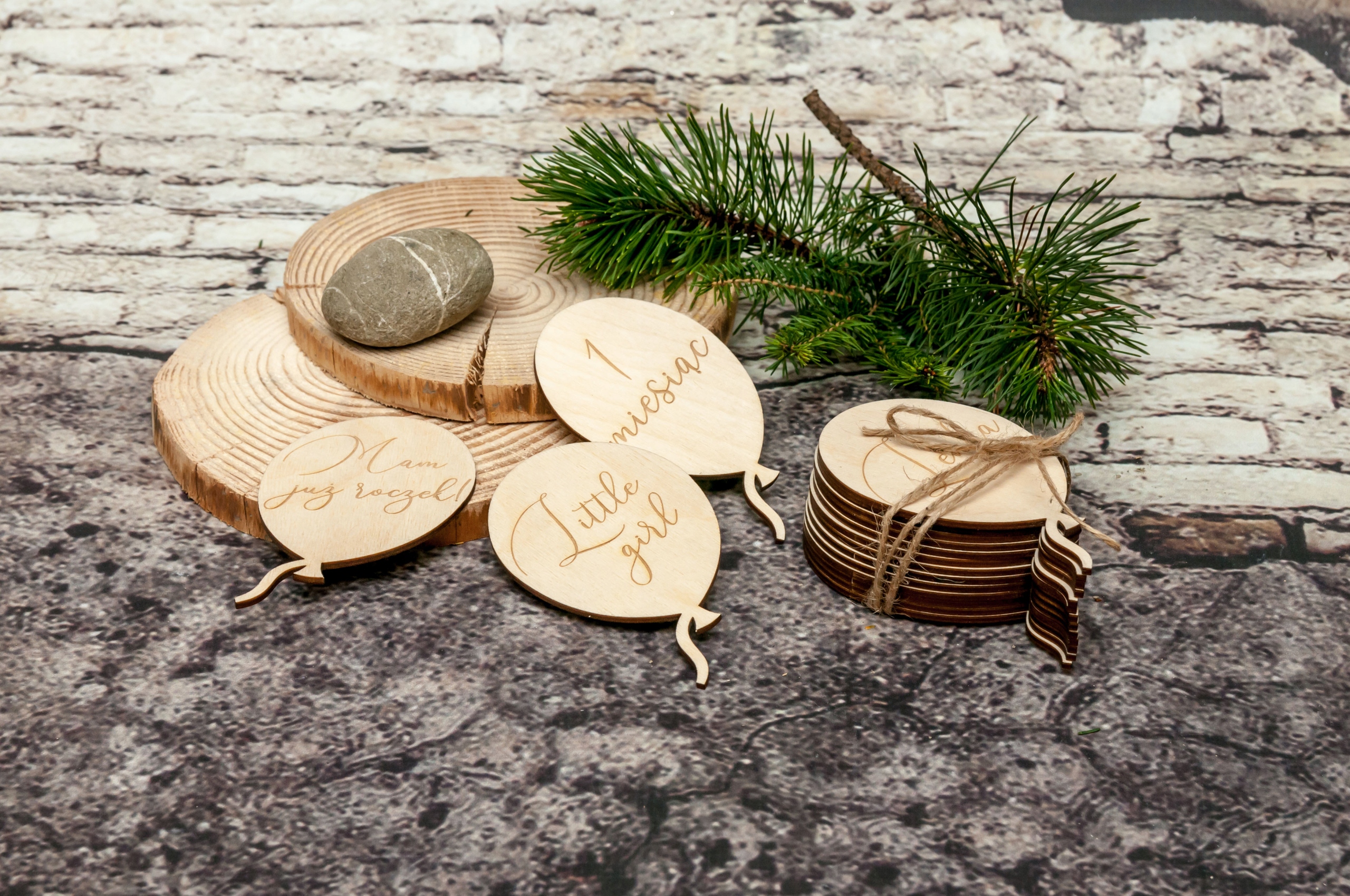 Деревянные тарелки с гравировкой в форме воздушных шаров.