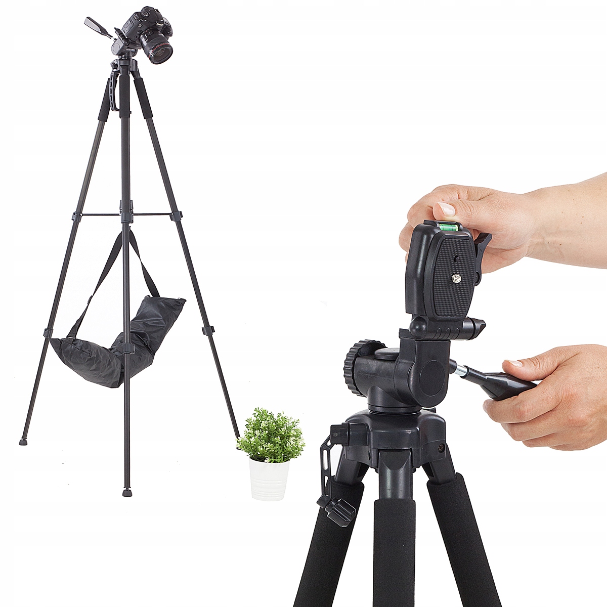 Верх штатива оснащен уровнем для проверки выравнивания. Дополнительная ручка позволяет безопасно переносить штатив между съемками.