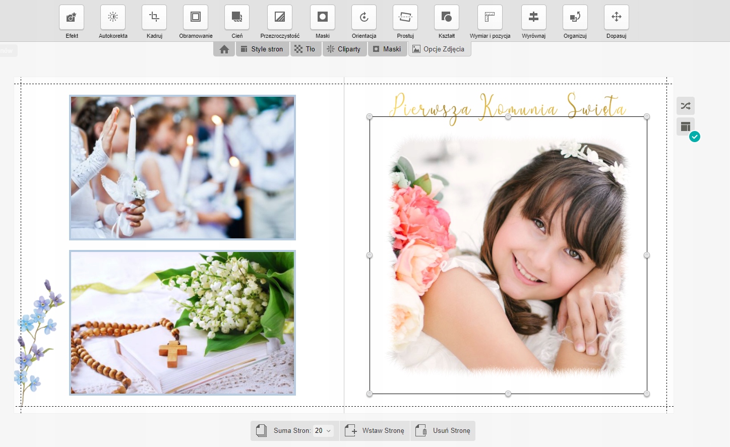 Ваш альбом не обязательно должен быть скучным. Добавьте свой собственный текст, клипарт и фон, чтобы оживить свой альбом. Измените форму фотографии, добавив маску, или улучшите ее качество с помощью бесплатной функции автокоррекции. В расширенном режиме редактирования вы также найдете такие параметры, как изменение формы и пропорций, добавление границы, эффектов, тени и маски. Работа над альбомом будет настоящим удовольствием!