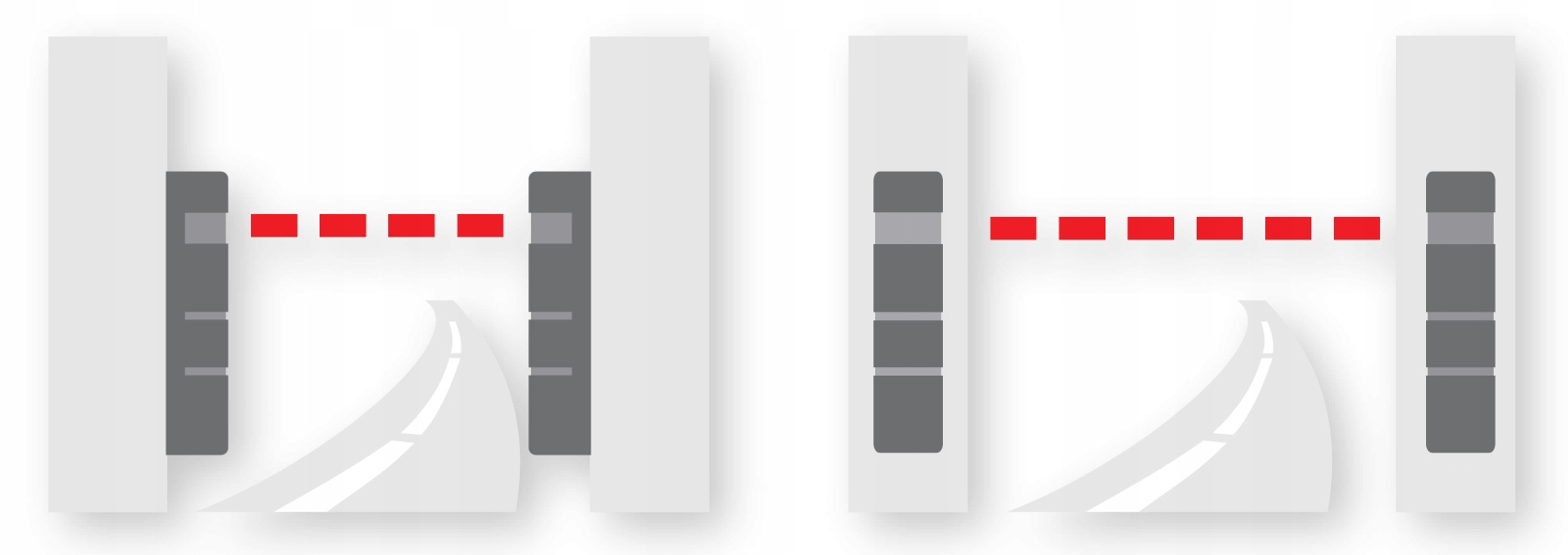 Фотоэлементы для предотвращения столкновений позволяют построить систему безопасности на высоких воротах, в которой благодаря своему расположению приемники фотоэлементов получают инфракрасное излучение не только от своего передатчика. Создание такой системы безопасности ворот с использованием стандартных фотоэлементов невозможно, поскольку фотоэлементы будут мешать друг другу. Примером такой ситуации является защита ворот на четырех высотах. Попытка решить проблему со стандартными фотоэлементами – установить их поочередно (см. рисунок). Если ворота широкие, высота установки фотоэлементов одинаковая, а препятствие и/или окружающая среда отражают свет, попеременная установка не решает проблему.