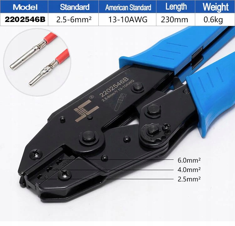 - рабочий диапазон: 3 гнезда для обжима кабелей сечением 2,5/4/6 мм2