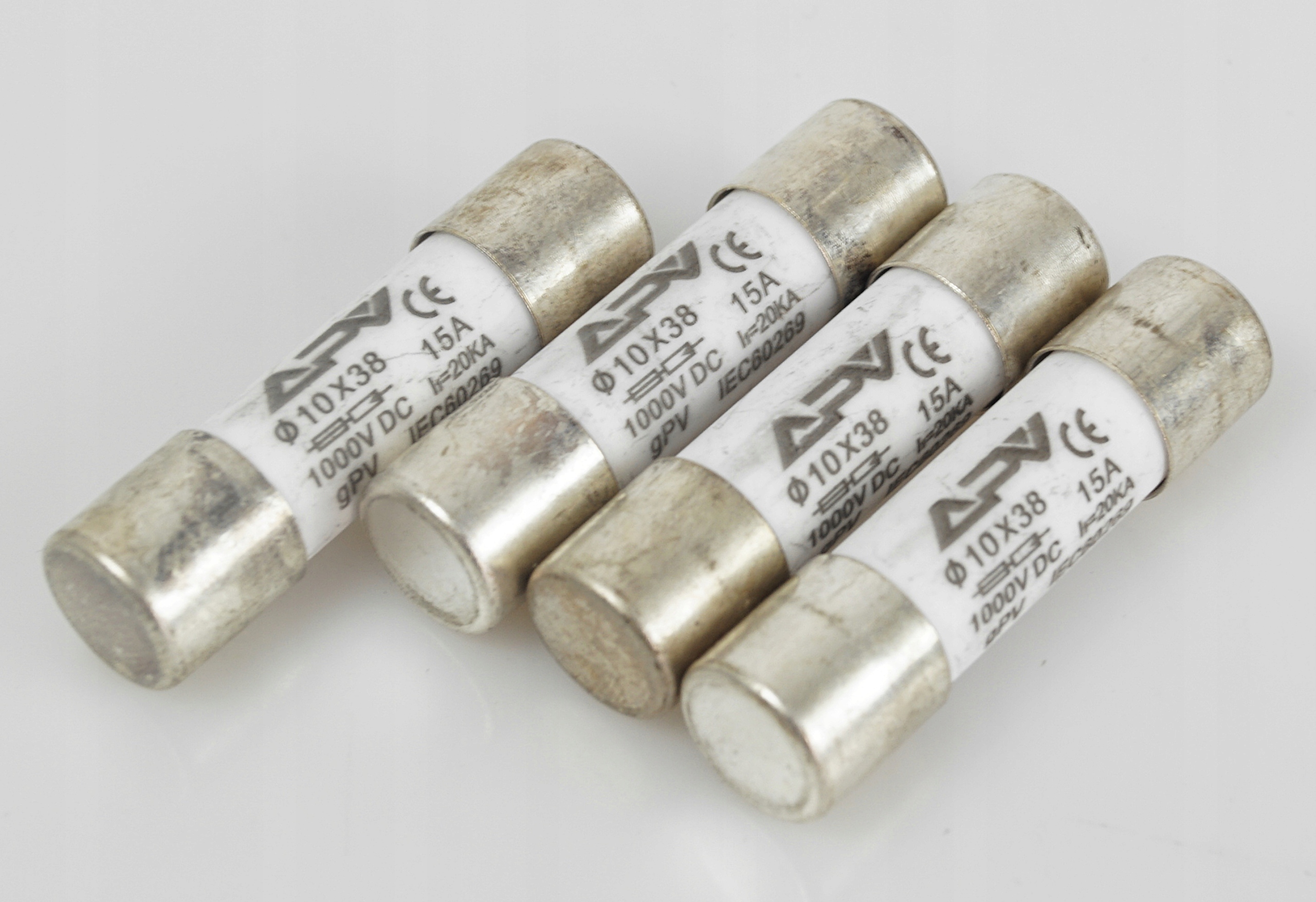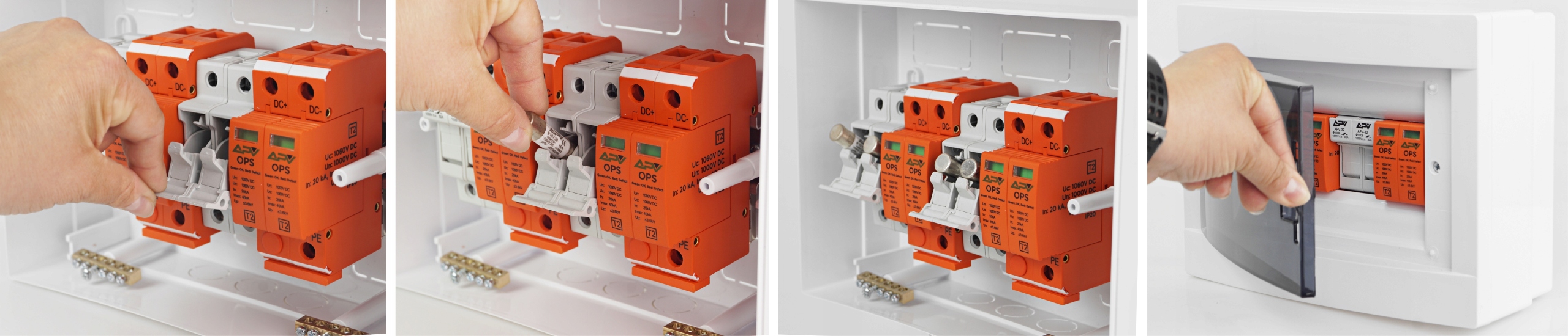 - Два выключателя с предохранителями APV, 2P 10x38 1000 В постоянного тока, состоящие из: двух оснований с предохранителями 2P и четырех gPV 15A трубчатые вставки.