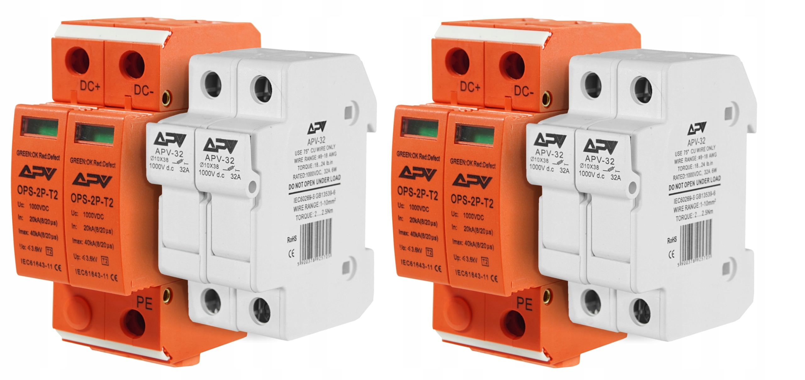 - Два ограничителя перенапряжения APV, 2P класс C [T2], 1000 В постоянного тока, 32 А, li>
