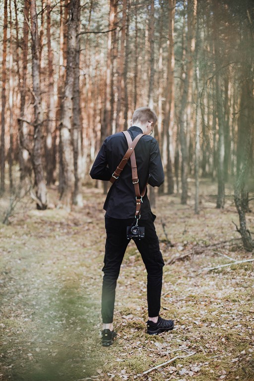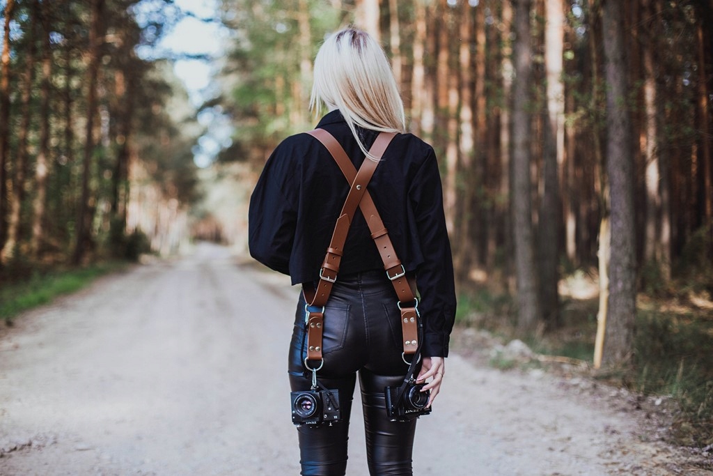 Подтяжки рассчитаны на одно или два боди. Светло-коричневая (карамельная) кожа итальянского происхождения и имеет красивую структуру натуральной лицевой кожи. Камера крепится с помощью универсального винта 1/4" и стального карабина М5, а элементом, скользящим по коже, служит стальное D-образное кольцо. Дополнительной защитой камеры от отсоединения является крепящаяся чрезвычайно прочная 10-миллиметровая лента. с карабином М4. Длина лямок регулируется с помощью ряда отверстий. Раскладывание плетения по спине с помощью машинной заклепки.