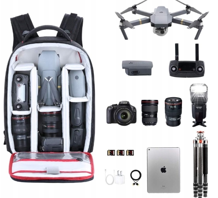 Этот рюкзак с камерой подходит для камер DSLR с прикрепленными объективами до 320 мм, 4-6 дополнительных линсов, вспышка, аксессолю 41 см * 27 см * 13,5 см.