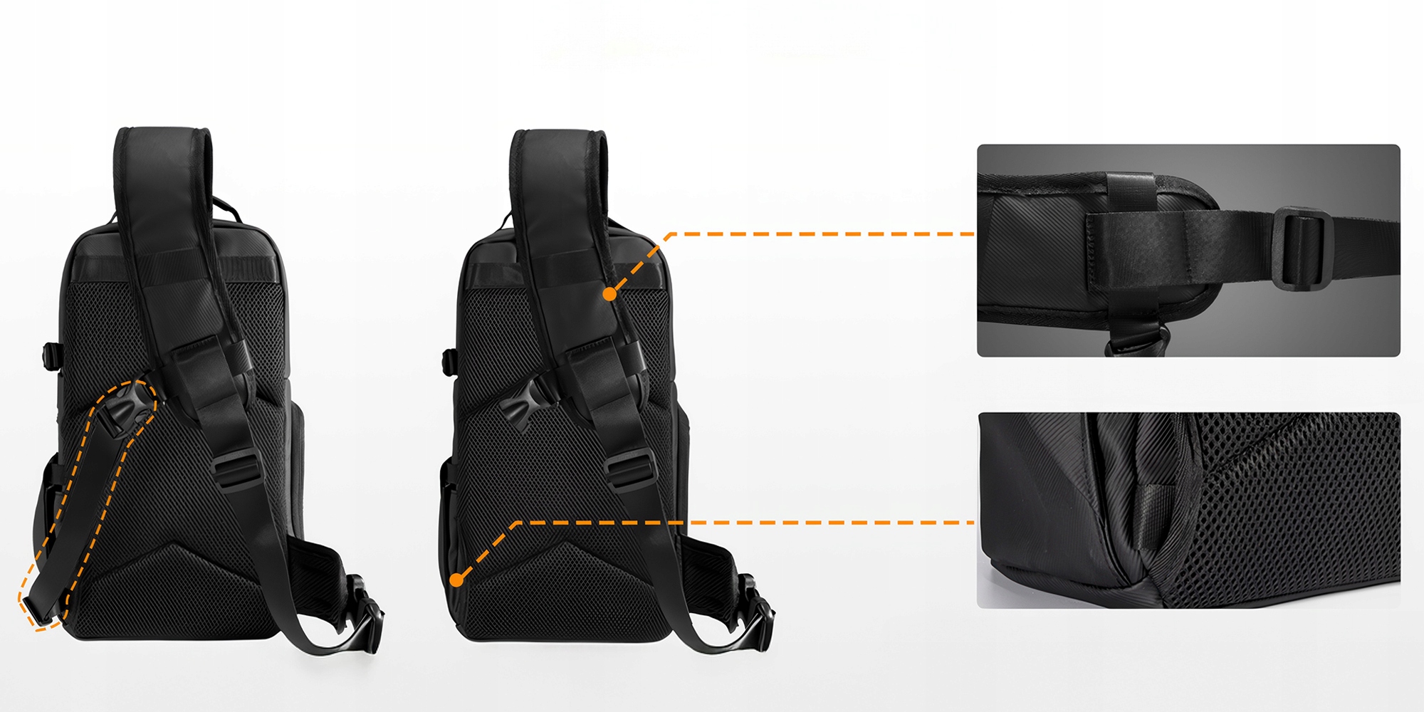 дышащие и широко мягкие брекеты и задняя панель обеспечивают комфорт даже во время длинных поездок в поисках идеальной рамы. Кроме того, рюкзак оснащен скрытым стабилизирующим ремнем, прикрепленным к талии. Это решение поможет вам равномерно распределить вес. Регулируемый плечевой ремешок (до 90 см) и стабилизирующий ремень (до 55 см) позволит вам идеально соответствовать рюкзаку с вашими предпочтениями. Благодаря этому, даже после многих часов ходьбы, вы все равно будете чувствовать себя приятной легкостью, а не боли в спине или плечах