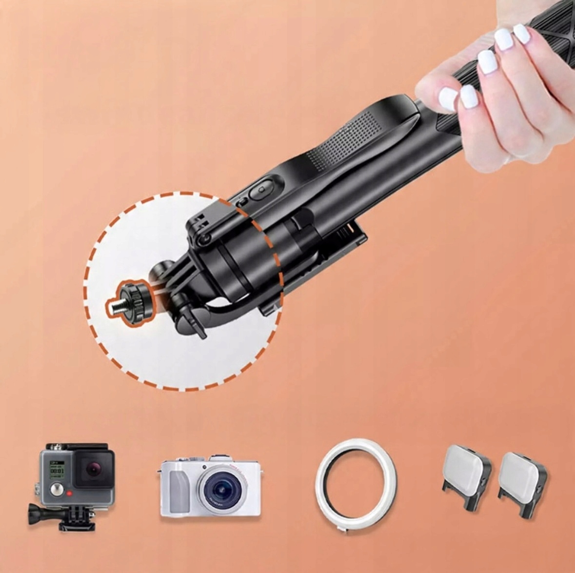 - Наверху существует универсальный винт 1/4 дюйма, который можно прикрепить к большинству камер, спортивных камер, веб-камеры, GoPro и т. Д.