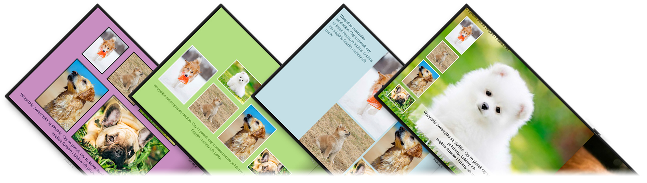 Этот дизайн хорошо подходит, если мы хотим разместить на странице много фотографий и текст под ними. Фотографии расположены в столбцах. Каждый столбец имеет одинаковую ширину, но может иметь разную высоту. Нижняя часть открытки предназначена для текста. Если на странице всего одна фотография, размером примерно с открытку, она размещается на всей странице. Если на левой странице есть одна очень широкая фотография, а на правой нет ни одной, фотография размещается на обоих листах бумаги.
