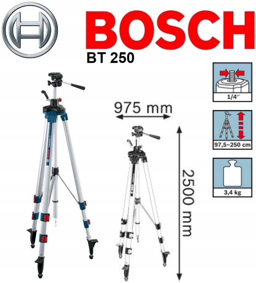 Штатив Bosch BT 250 — профессиональное устройство, предназначенное для установки лазеров. Обеспечивает абсолютную стабильность работы линейных и поперечных лазеров на любом типе поверхности.
