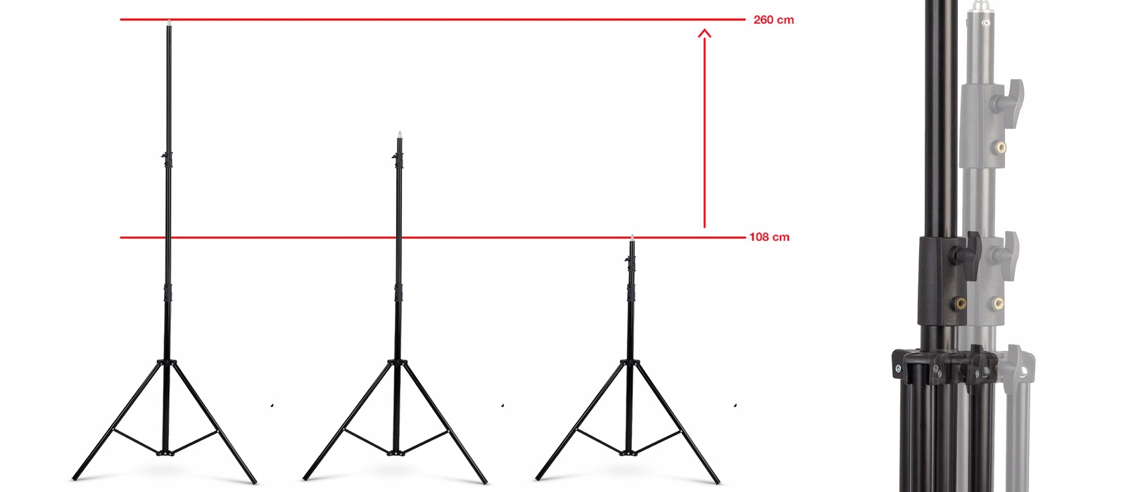 В комплектах StudioPro™ используется минимум 2 лампы за счет взаимной компенсации теней – одна лампа служит основным светом, другая лампа – дополнительным светом. Светильники размещаются на регулируемой осветительной стойке высотой 260 см, что позволяет легко настроить освещение под текущие нужды. Дополнительно штативы оснащены пружинной амортизацией, что существенно повышает безопасность установленного на них оборудования.
