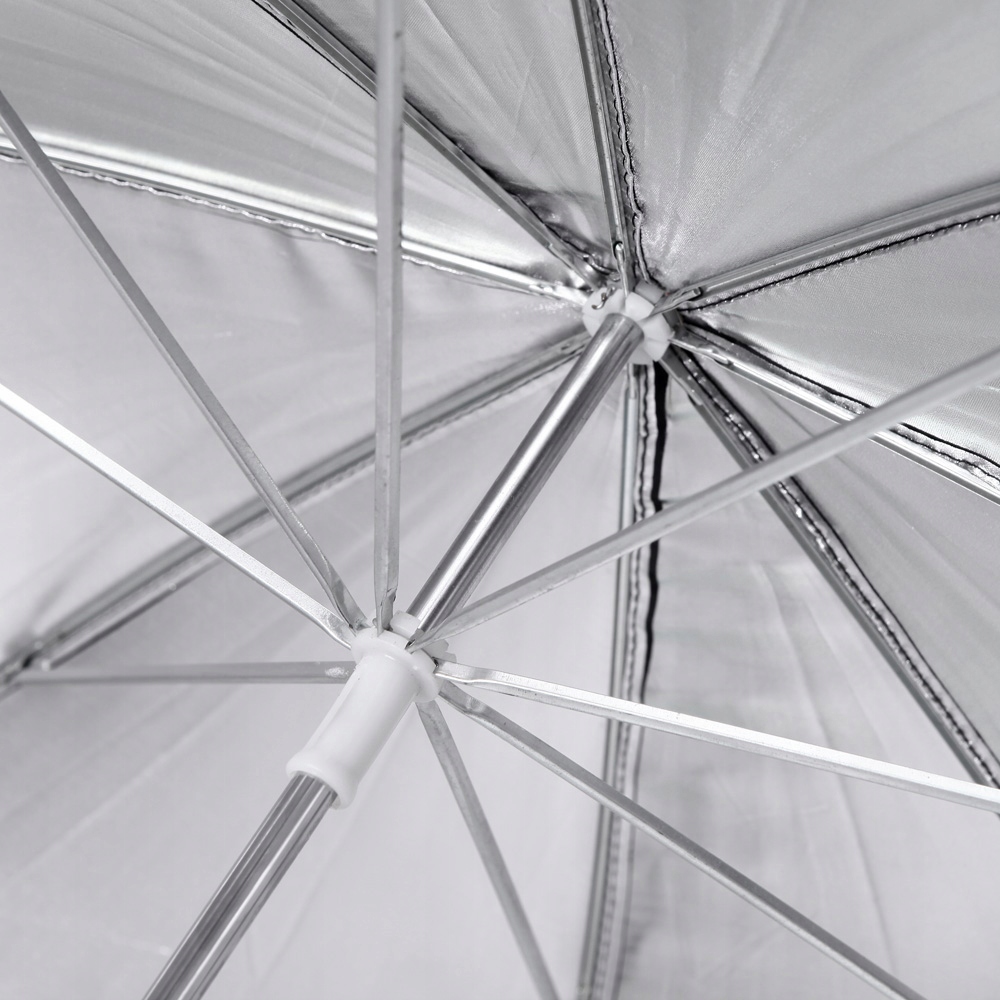 Этот студийный зонт с отражателем состоит из двух слоев (черный и серебристый): черный снаружи и серебристый внутри.