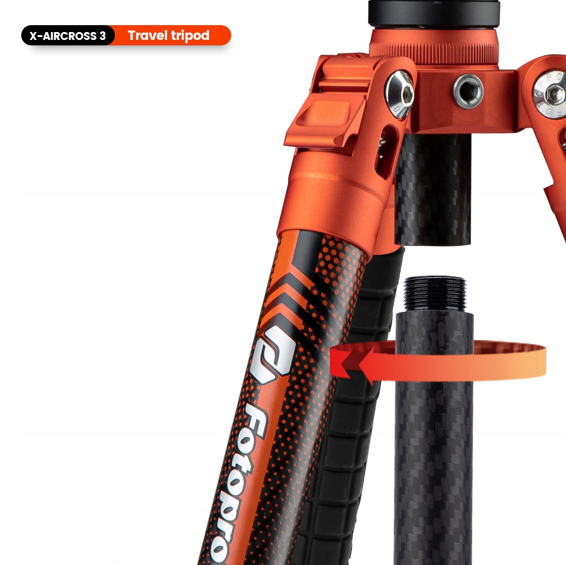 Измененная конструкция штатива X-Aircross третьего поколения позволяет ему занимать еще меньше места. Его высота в транспортном положении составляет 36,5 см. Все сделано из легкого и прочного карбона 3К. Кроме того, одна из трех ножек штатива отделана приятной на ощупь силиконовой ручкой. Производитель также предусмотрел противоскользящие ножки и крючок, на который можно повесить дополнительный груз, гарантируя достаточную устойчивость в ветреные дни.