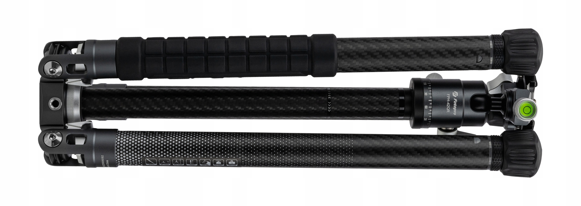 В комплект к штативу Fotopro X-Aircross 3 входит шаровая голова FPH-42QR. Он оснащен эргономичными ручками, позволяющими регулировать положение камеры, установленной на пластине быстрого крепления. Также имеется точная угловая шкала и спиртовой уровень. Головка обеспечивает плавное панорамирование на 360°. Благодаря соответствующему дизайну снимать или фотографировать можно как горизонтально, так и вертикально. Все эти решения обеспечивают большую универсальность, которая будет хорошо работать как в студии, так и в дороге.