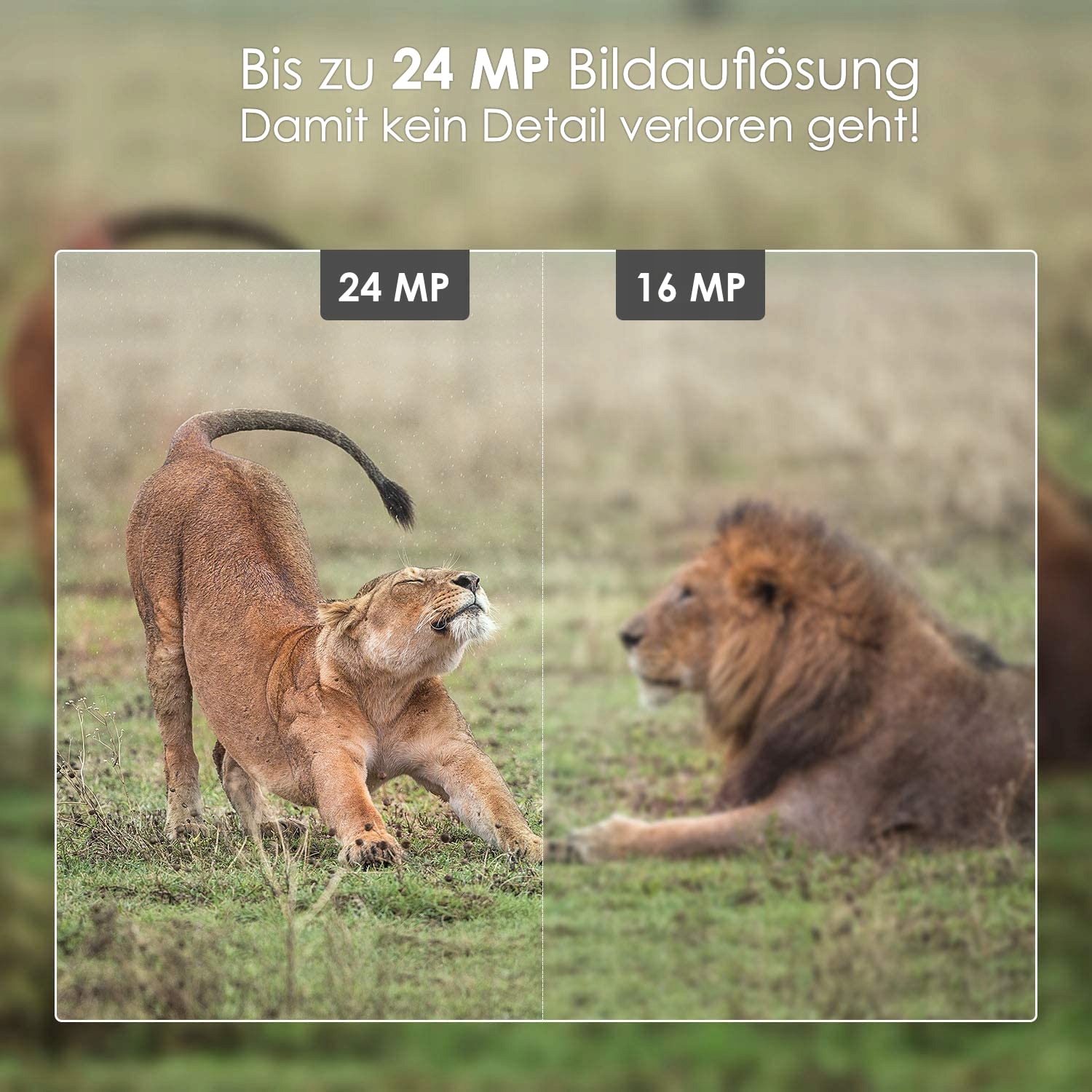 Красочные записи в течение дня и хорошо освещенные черно-белые ночные фотографии благодаря встроенному автоматически переключенному ИК-фильтру. Невидимый широкополосный светодиодный свет (940 нм) для освещения ночью, незаметный для людей и животных, без красноречивого темно -красного свечения. Три отдельных датчика движения PIR с задержкой освобождения 0,2 секунды и 120 ° покрытие также фиксируются животными, которые смотрят только рядом или не находятся непосредственно перед камерой диких животных.