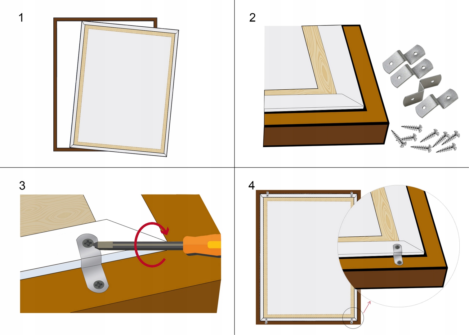 Картину можно закрепить в рамке с помощью специальных вкручивающихся креплений, которые идут в комплекте с рамой.