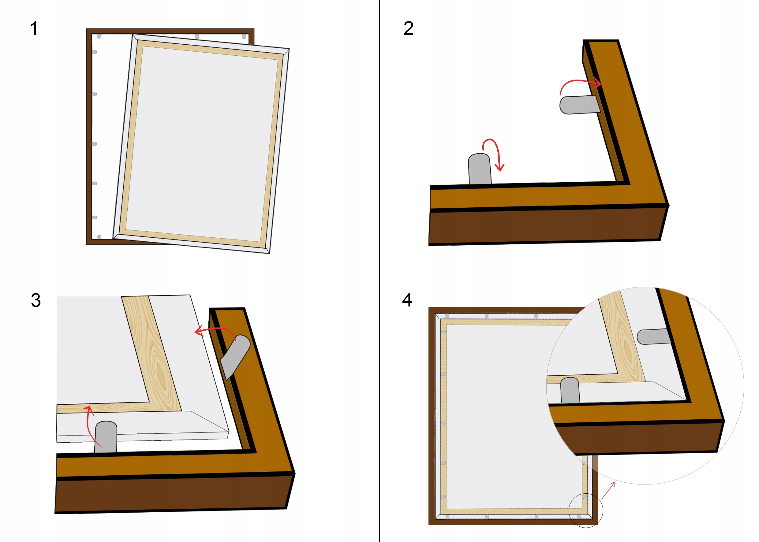 Поместив холст в раму, просто слегка согните монтажные кронштейны, чтобы закрепить картину. Это обеспечит надежную фиксацию полотна на месте и не сдвинется с места.