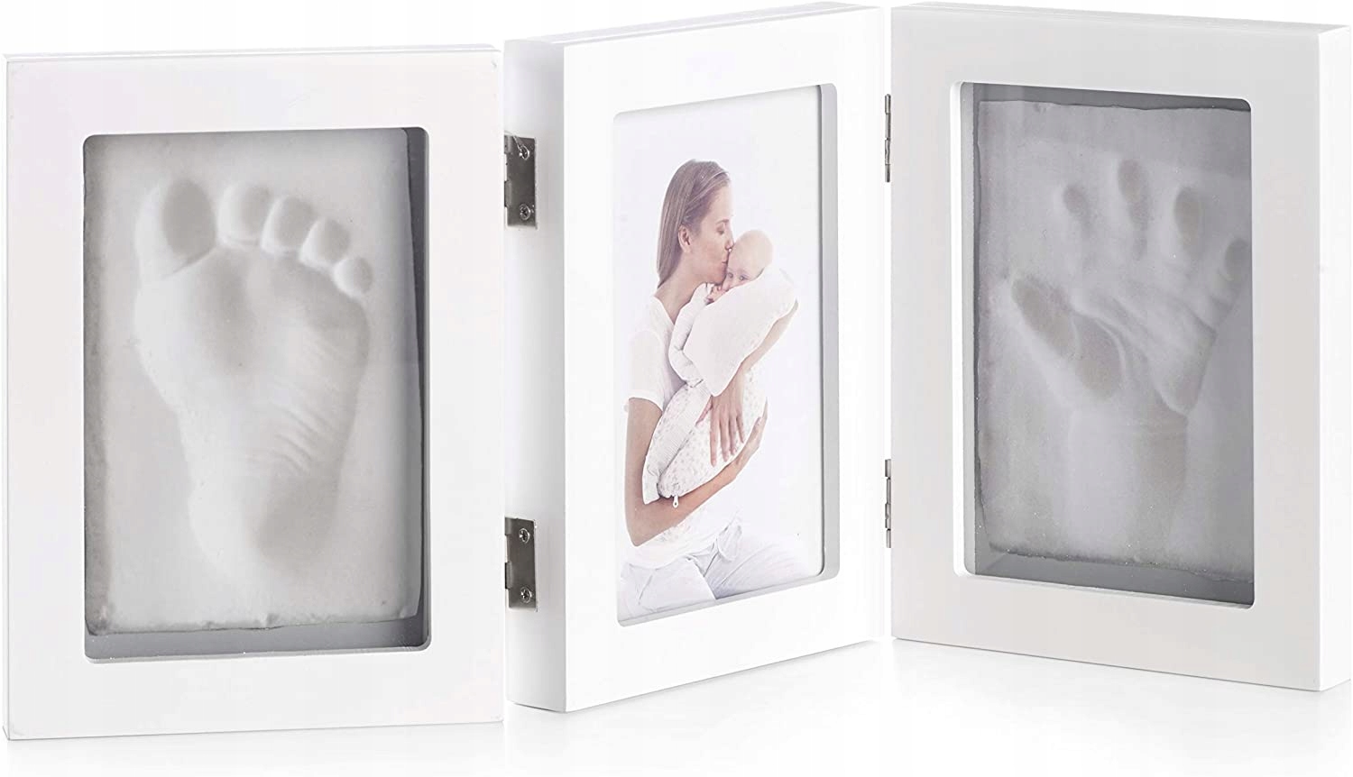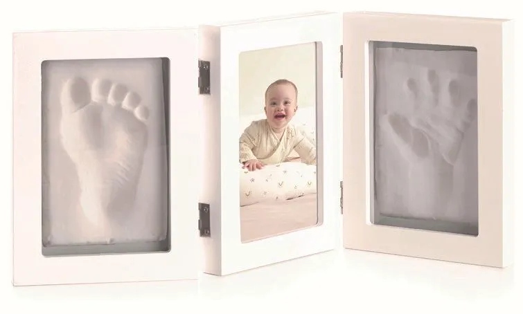 Рамка для фото на 2 следа ребенка или отпечатки рук. С помощью фоторамки Jané вы можете разместить в рамке следы ног или рук вашего ребенка, чтобы создать красивый подарок на память. Состоит из 3-х белых рамок, соединенных вместе: одна для фотографии ребенка, две другие для отпечатков рук и ног.