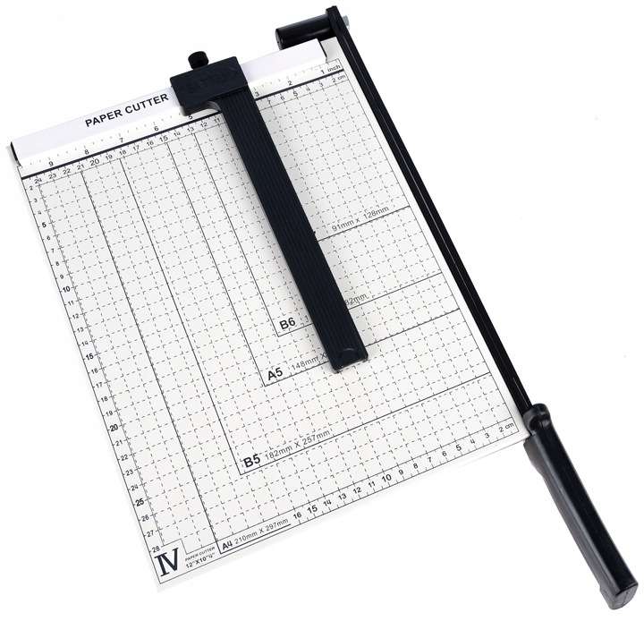Гильотина изготовлена из высококачественной, прочной, закаленной стали. Закаленное лезвие позволяет быстро и точно разрезать бумагу, листовки, фотографии и визитки до нужного размера. Режет файл до 12 листов бумаги плотностью 80 г/м2. Оснащен удобной измерительной сеткой (единицы измерения: дюймы, сантиметры) со стандартными форматами бумаги (В7, В6, А5, В5, А4).