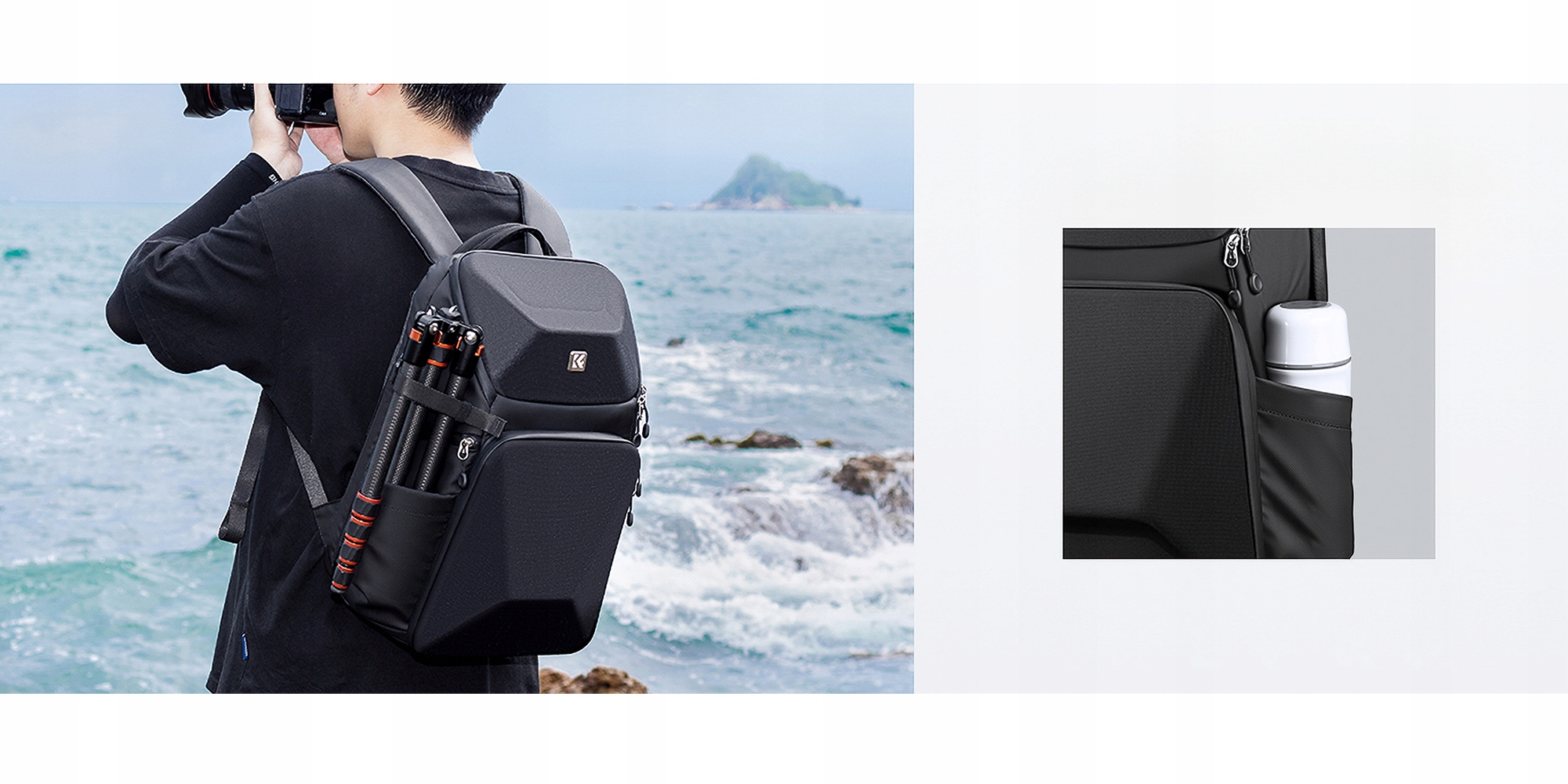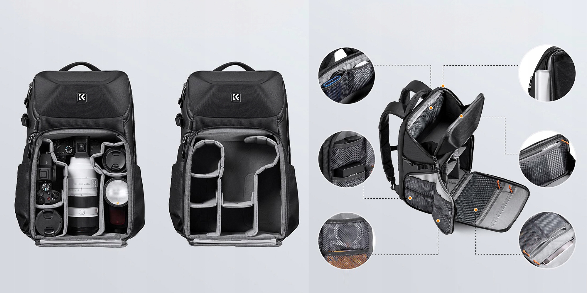 Рюкзак K&F Concept Beta Backpack объемом 20 л оснащен двумя клапанами на молнии, которые обеспечивают доступ к его внутреннему пространству — сверху и спереди. Это обеспечивает удобный доступ к отдельным разделам. Боковые карманы идеально подходят для штатива или бутылки с водой. Специальные ремни позволяют дополнительно закрепить снаряжение. Большое количество карманов для аксессуаров позволяет легко хранить SD-карты, кабели, аккумуляторы и другие мелкие предметы, что помогает организовывать и поддерживать порядок в рюкзаке.