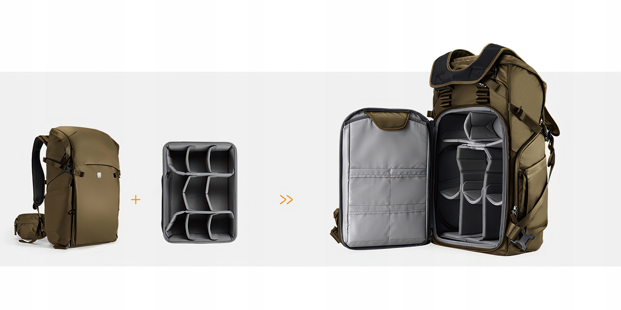 Рюкзак для фотосъемки K&F Concept Star Wander 04 создан для гибкого управления пространством в любых условиях. Внутри вы найдете профессиональный фотовкладыш с восемью отделениями (4 маленьких, 2 средних и 2 больших), которые вы можете свободно переставлять под конкретный набор техники. В нем с успехом можно разместить несколько камер, объективов, дрон и аксессуары. После снятия вставки, которая может работать автономно, рюкзак превращается в классический багаж – повседневный или дорожный.