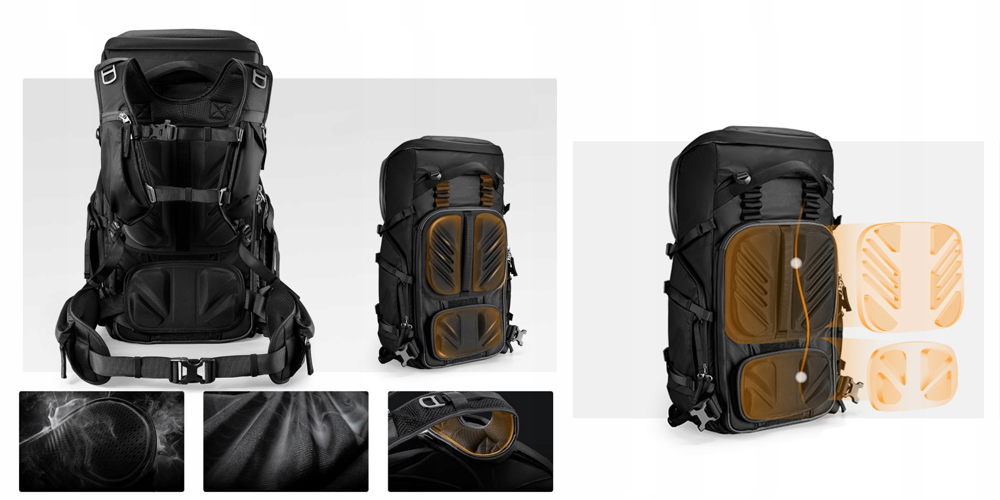 Система переноски рюкзака K&F Concept Star Wander 05 рассчитана на многочасовую работу в пути. Трехуровневая регулировка ремней позволяет идеально подогнать их высоту под рост пользователя. Широкий дышащий поясной ремень обеспечивает эффективную разгрузку позвоночника. Профилированная задняя панель с многоканальной вентиляцией предотвращает перегрев и скопление влаги. Алюминиевая внутренняя рама стабилизирует конструкцию и равномерно распределяет вес.