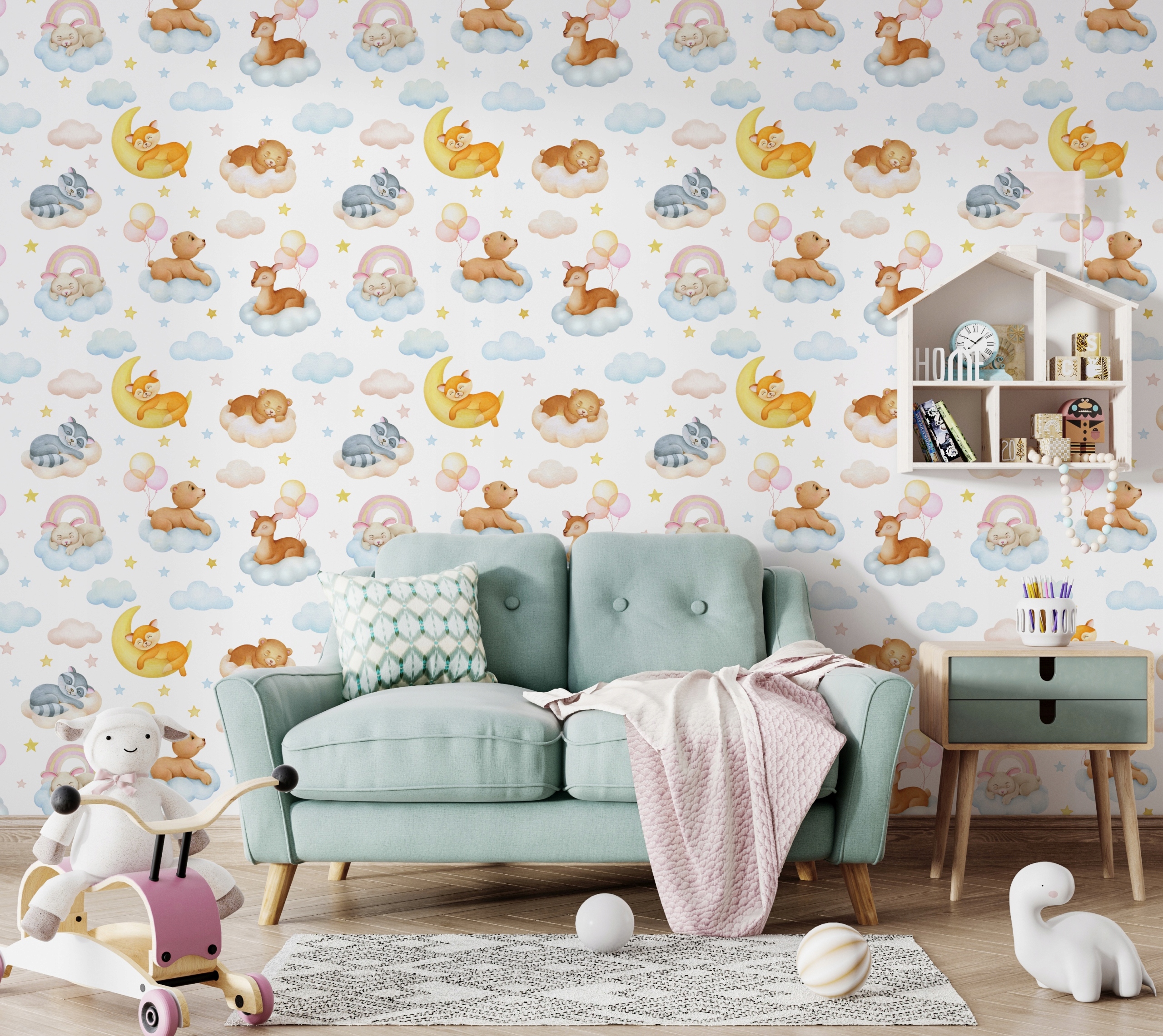 Фотошпалери для дітей, шпалери ведмедики, хмари, кульки, тварини, веселка, на замовлення