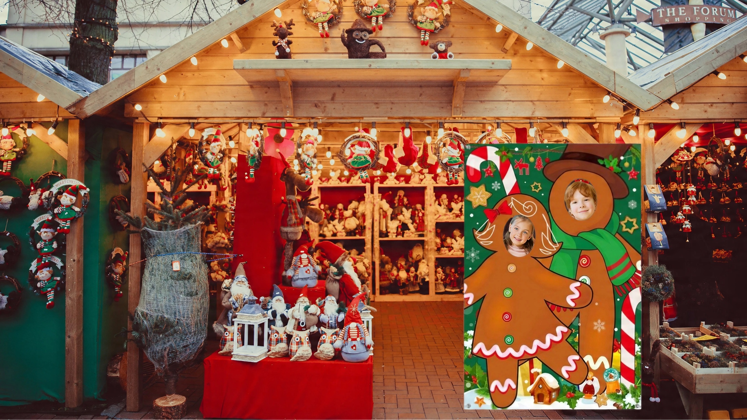 ✔️ Фотостена была создана с учетом Рождества, поэтому она содержит рождественские мотивы, то есть дом, ель, елочные украшения, красный бантик, снежинки и два коричневых пряника, в которые дети могут превратиться, поместив лица в предназначенные для этого отверстия.