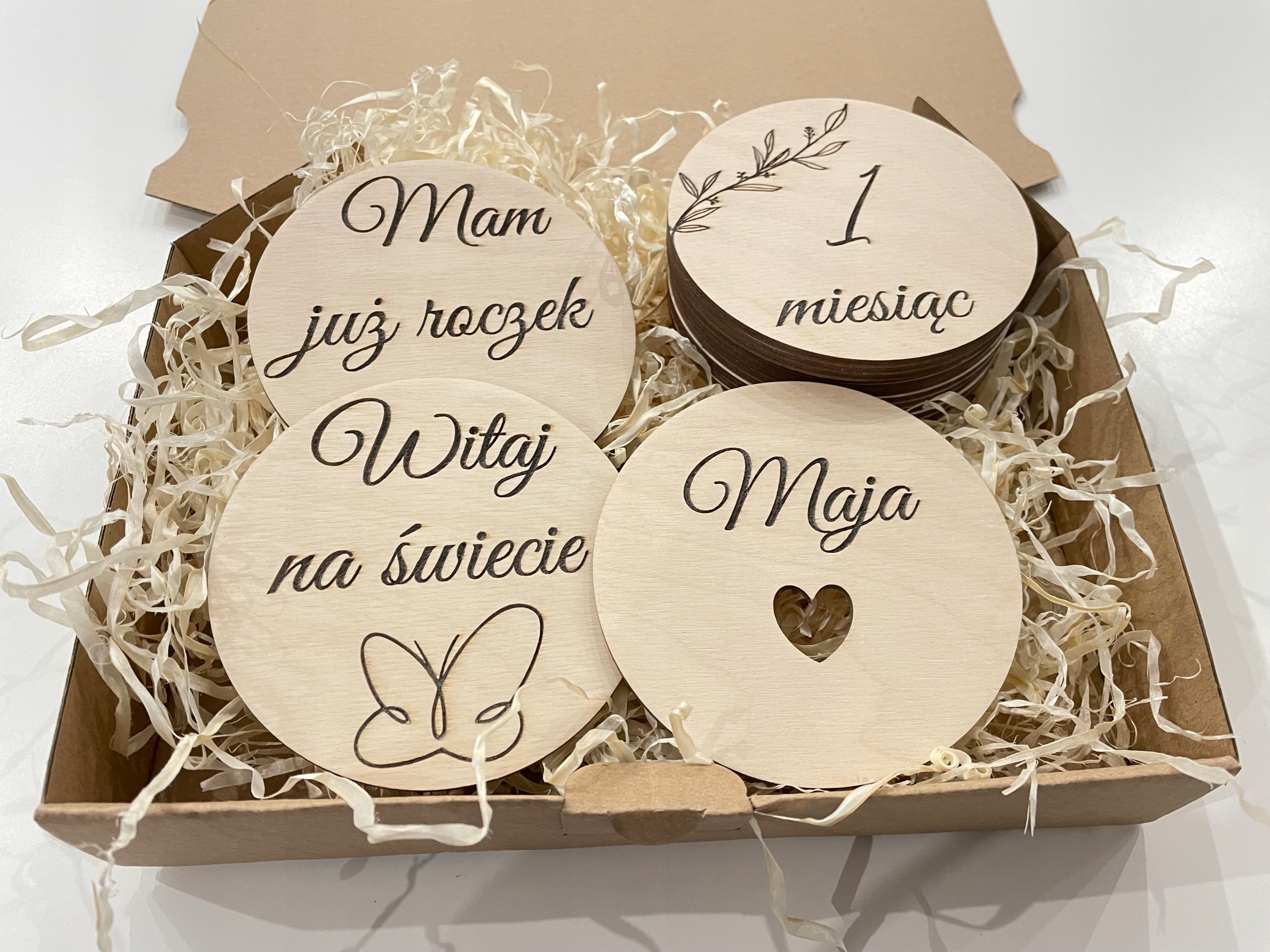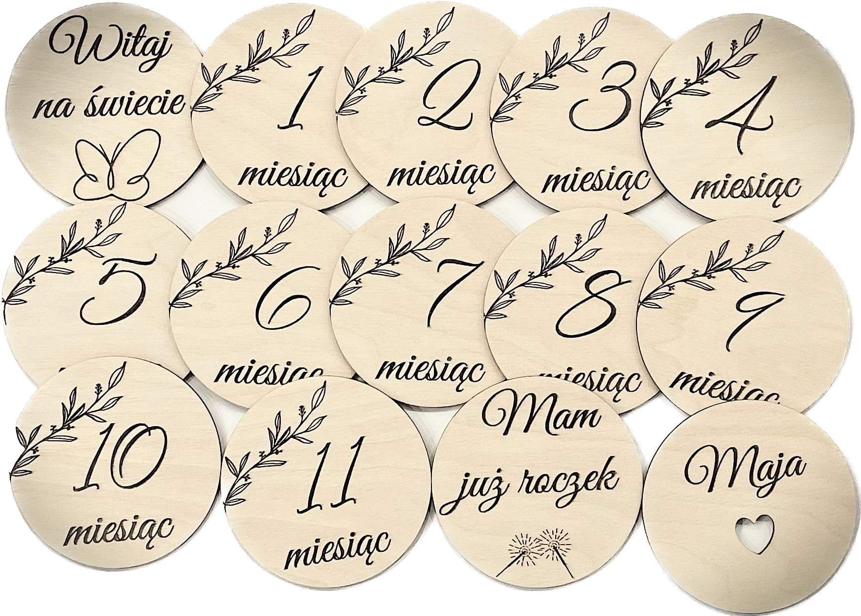 Набор деревянных досок для фотографий первых 12 месяцев жизни малыша. Таблички сделают фотографии оригинальными, а время подрастающего ребенка будет фиксироваться по пластинкам с месяцами.
