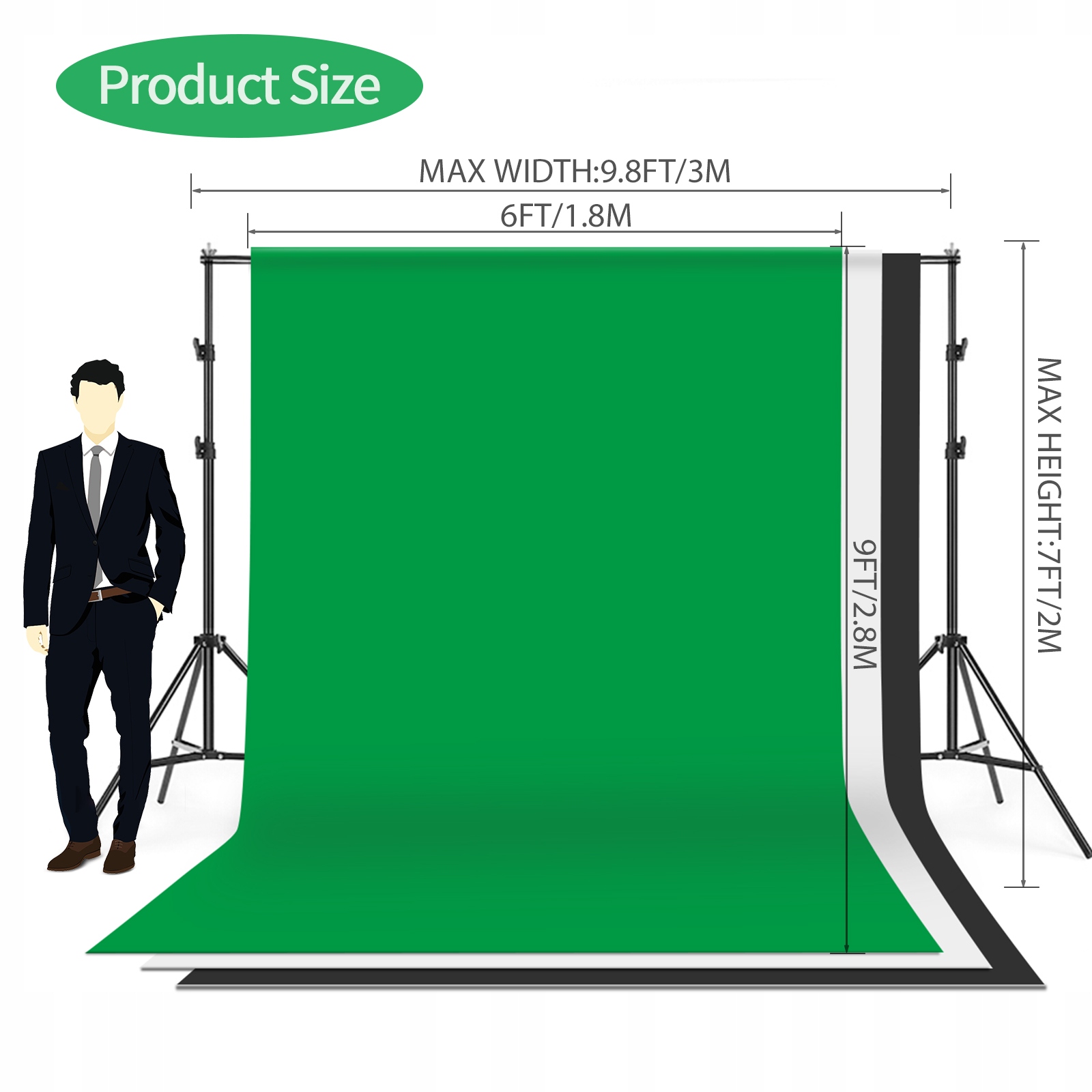 - 1,8 * 2,8 м черный, белый и зеленый хлопковый фон. Достаточно большой для большинства случаев фотосъемки, отлично подходит для студийной и портретной съемки.
