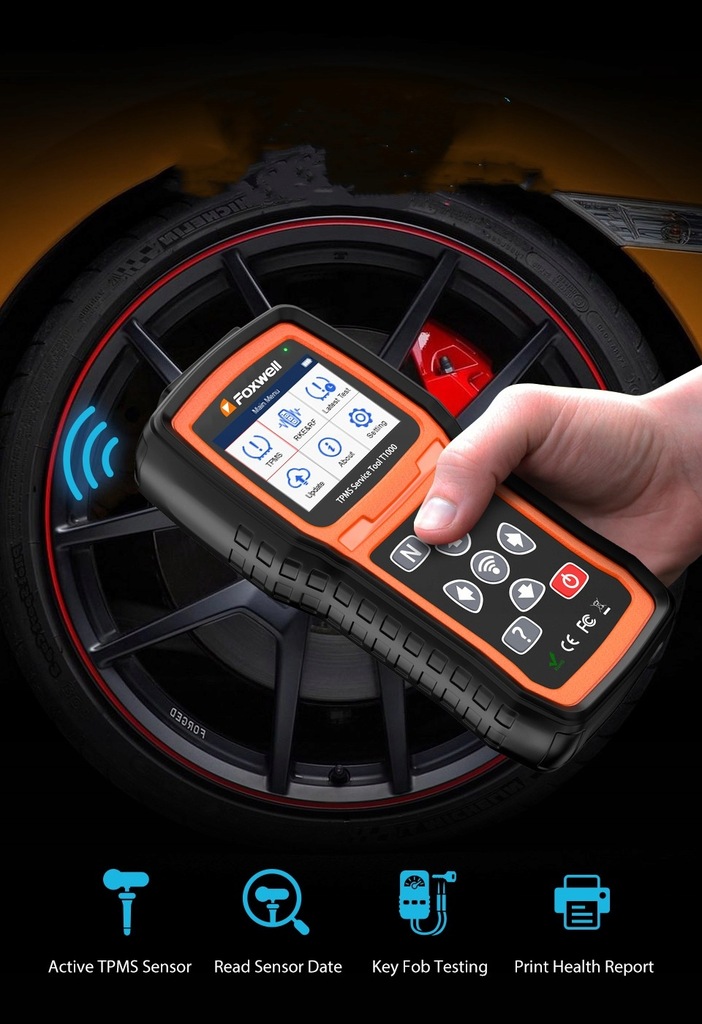 Foxwell T1000 Тестер датчика давления в шинах-это независимое устройство, оснащенное светодиодным дисплеем, встроенной литий-полимерной батареей, бронированного резинового корпуса и водонепроницаемой клавиатуры.