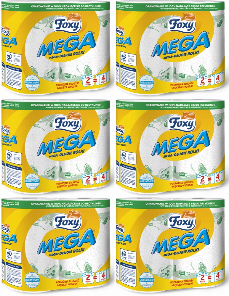 - 2 рулона Mega Foxy соответствуют 4 стандартным рулонам бумаги — эффективное и экономичное решение.