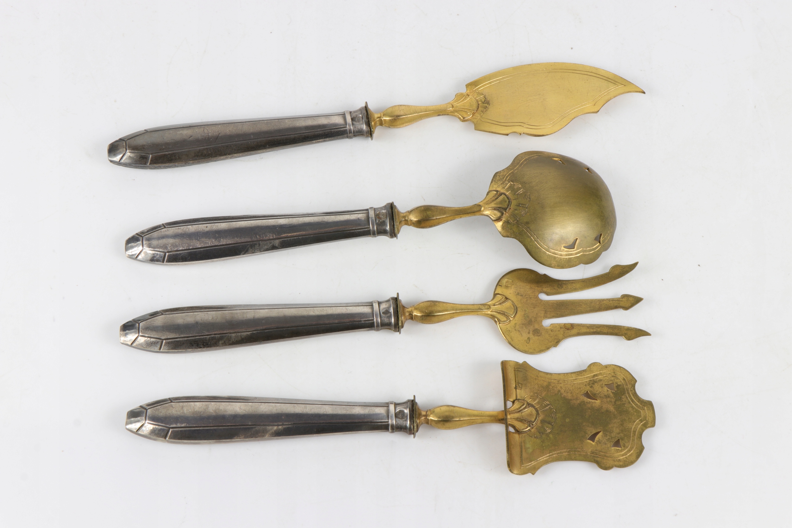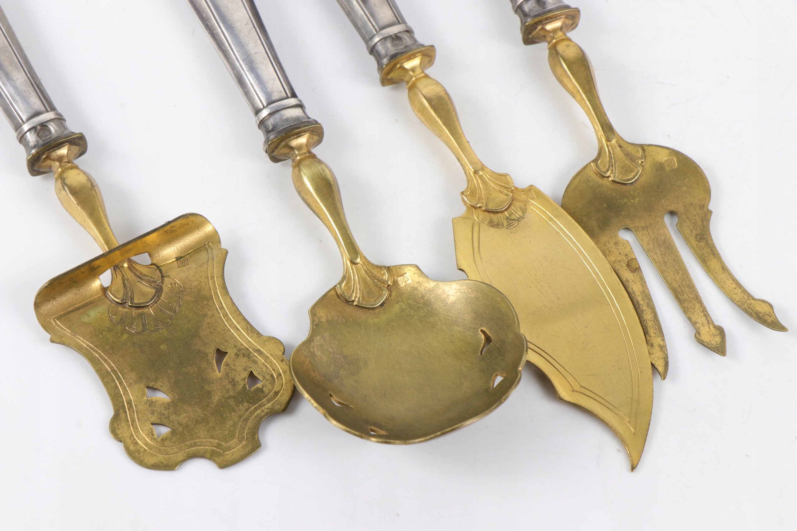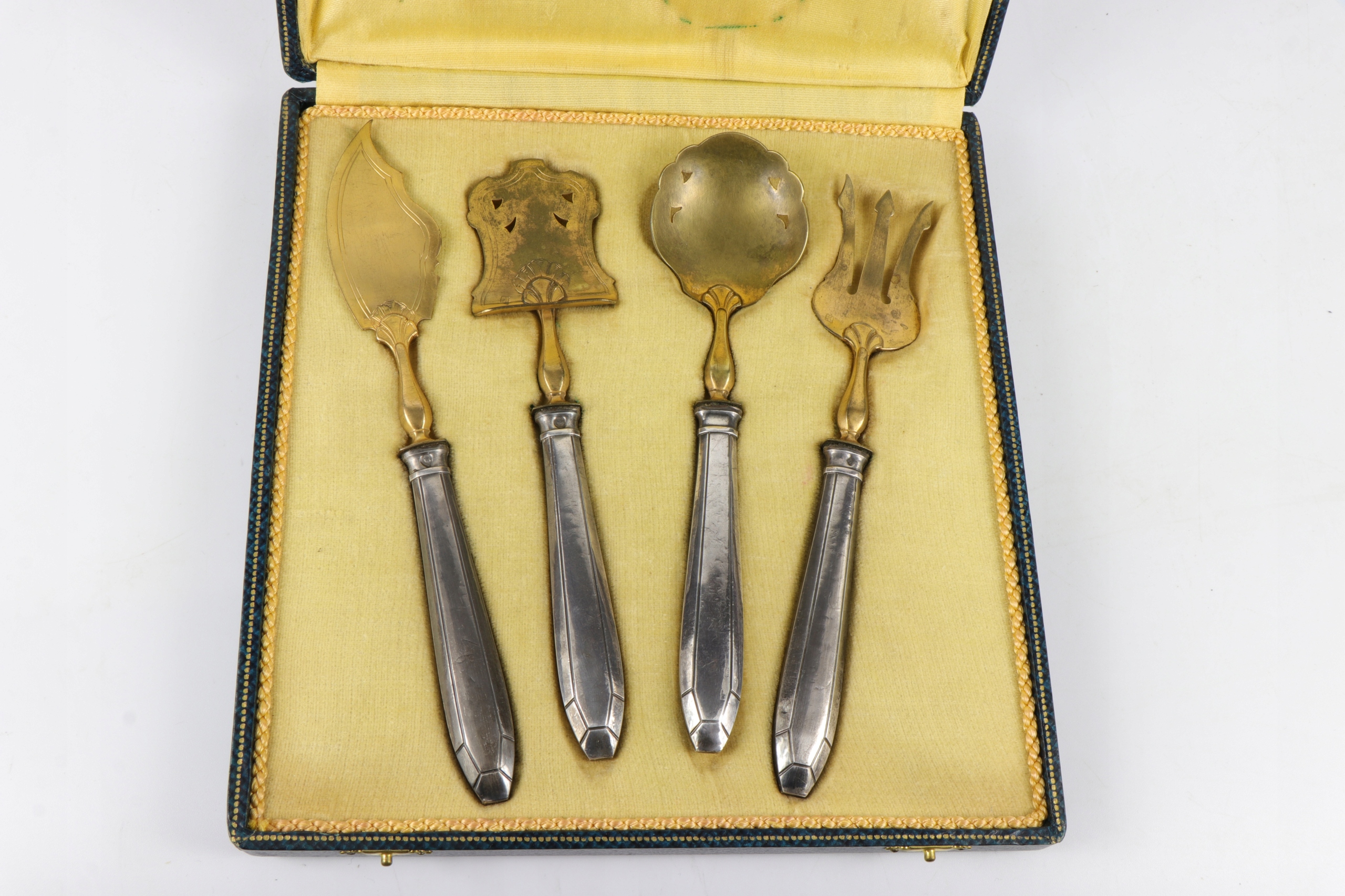 Серебро для печенья, запускающая центр таблицы в исходном случае. Все элементы подписали главу минерала пунки и на латунных деталях со знаком производителя. Серебряный знак, Minerva France 800, использовался с 1838 года. Самый утилитный набор. Красивый очень элегантный элемент декора каждого стола. Только чехлы для столовых приборов - серебряные.