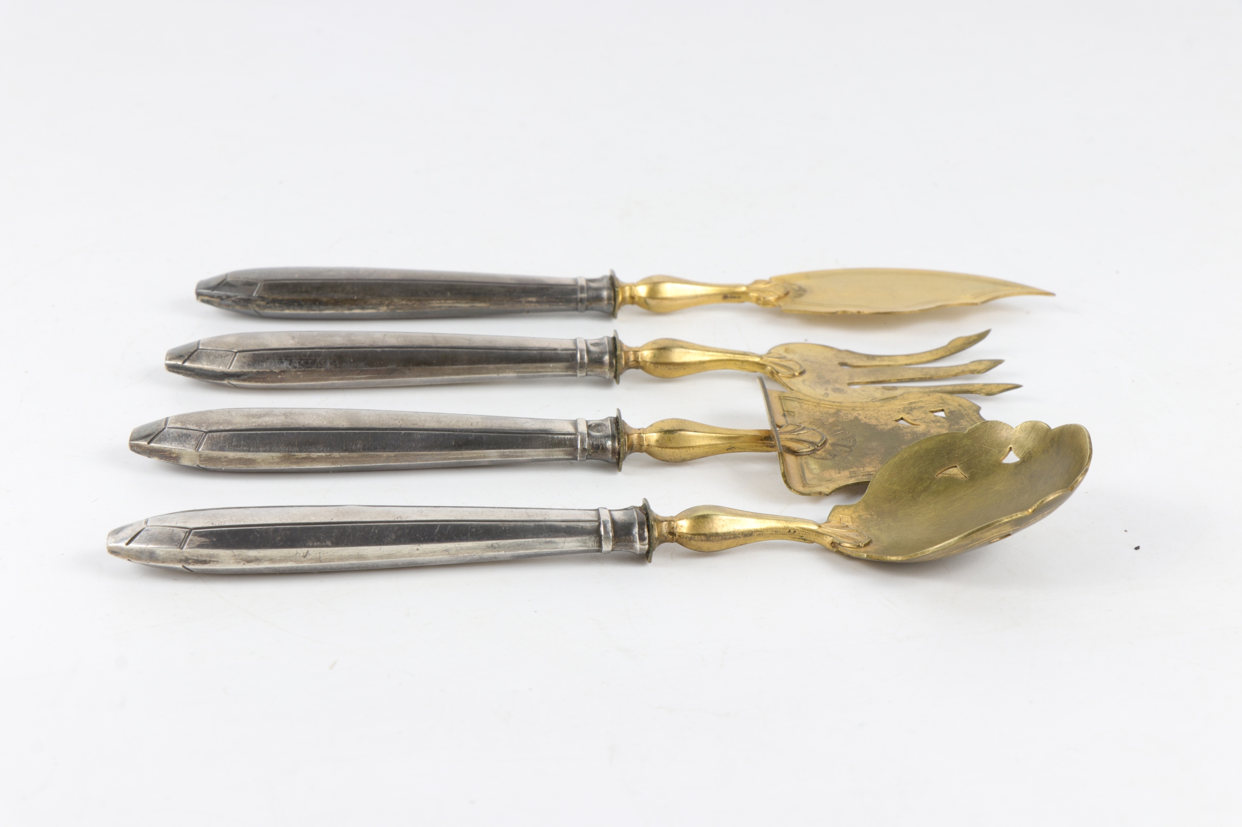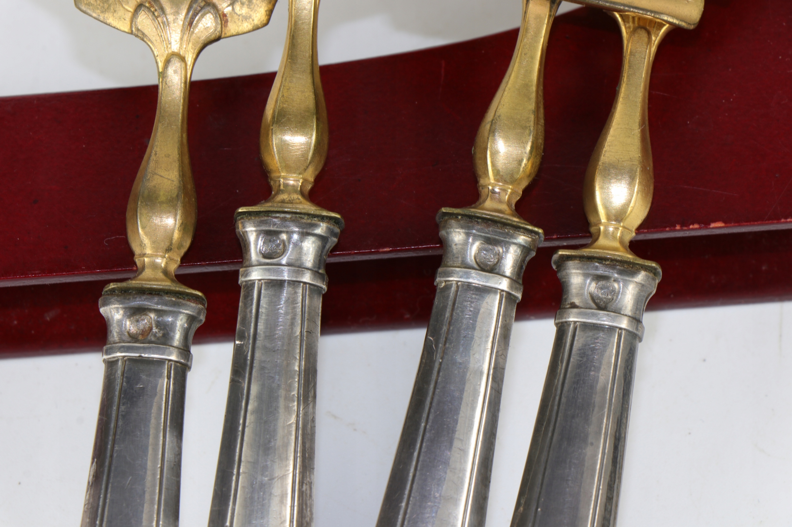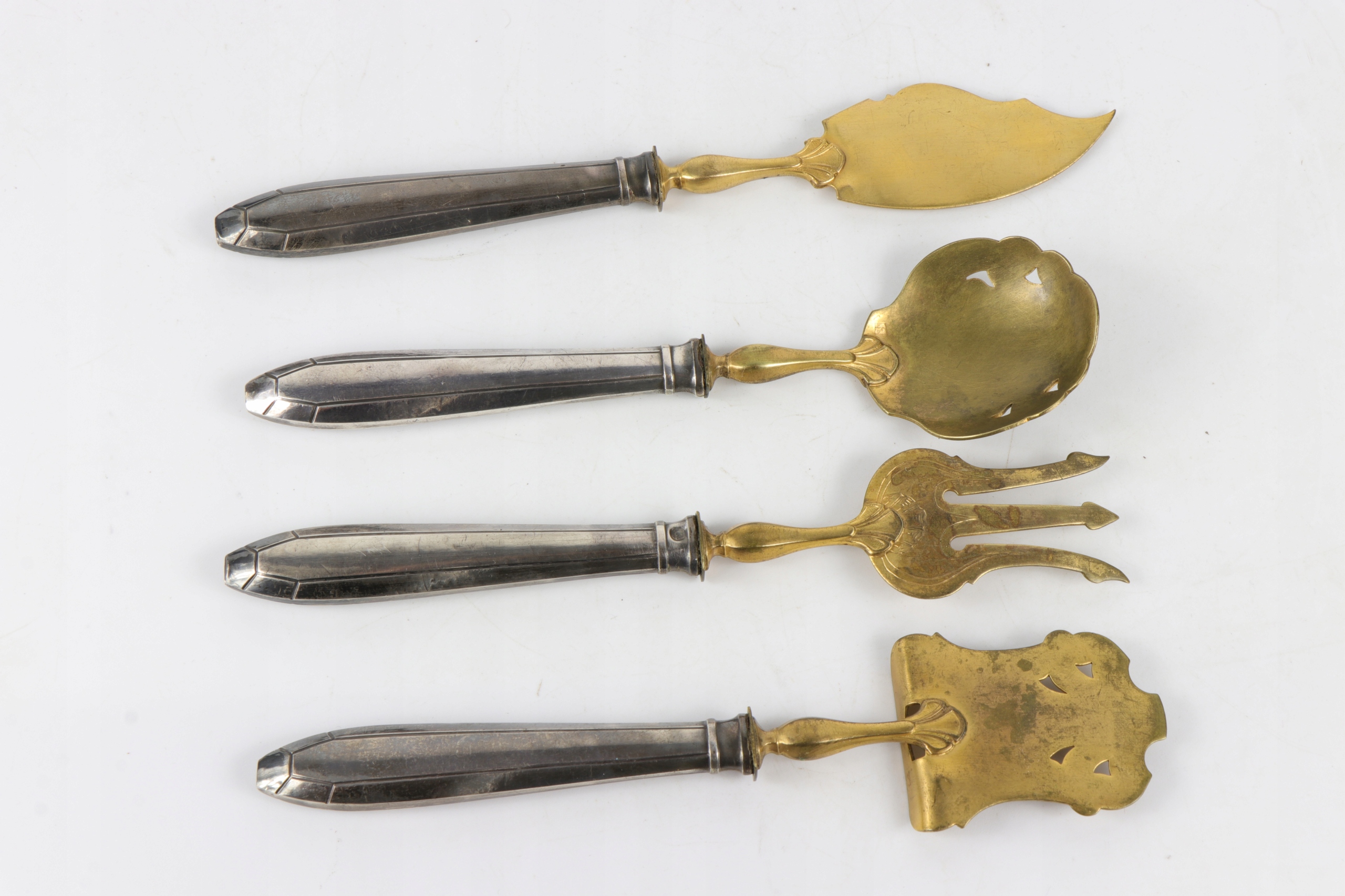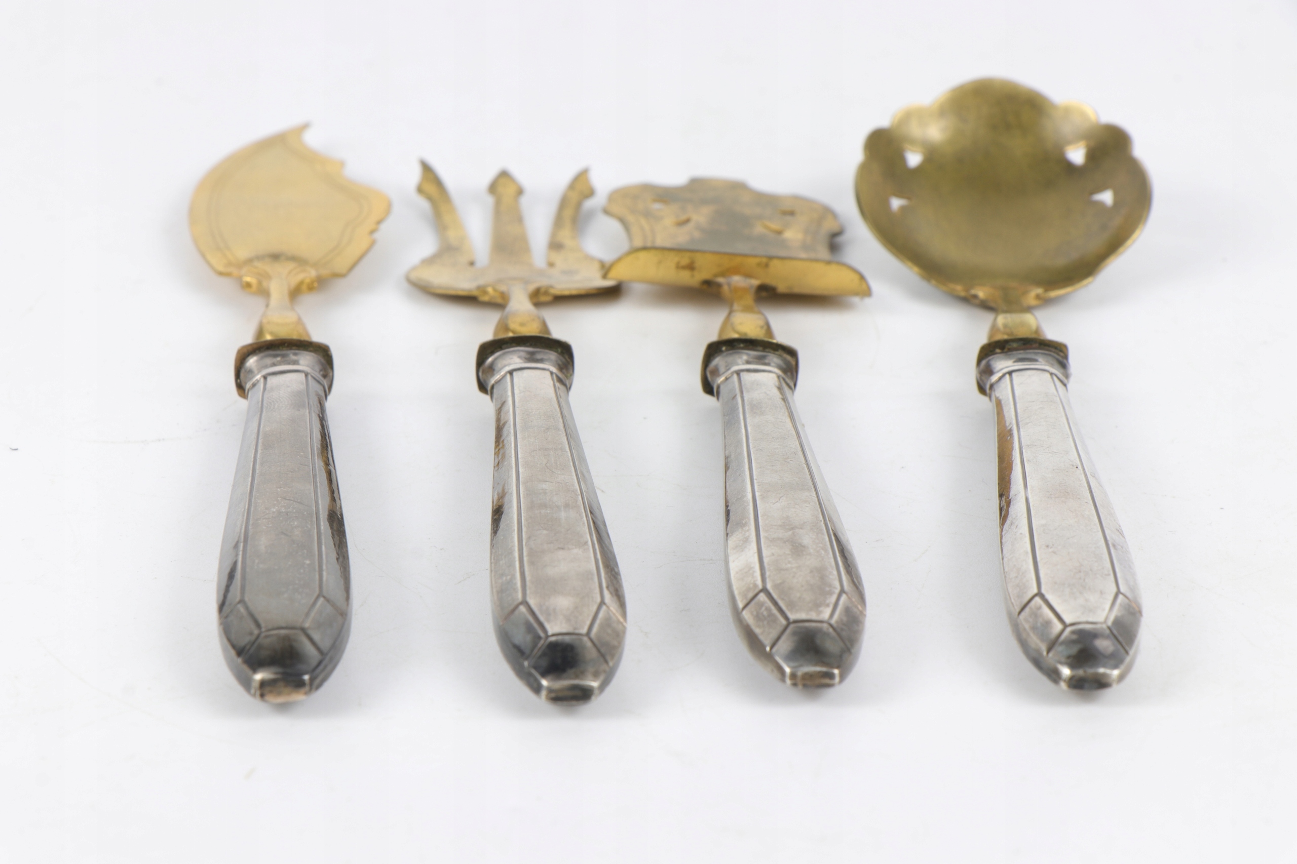 Серебро для печенья, запускающая центр таблицы в исходном случае. Все элементы подписали главу минерала пунки и на латунных деталях со знаком производителя. Серебряный знак, Minerva France 800, использовался с 1838 года. Самый утилитный набор. Красивый очень элегантный элемент декора каждого стола. Только чехлы для столовых приборов - серебряные.