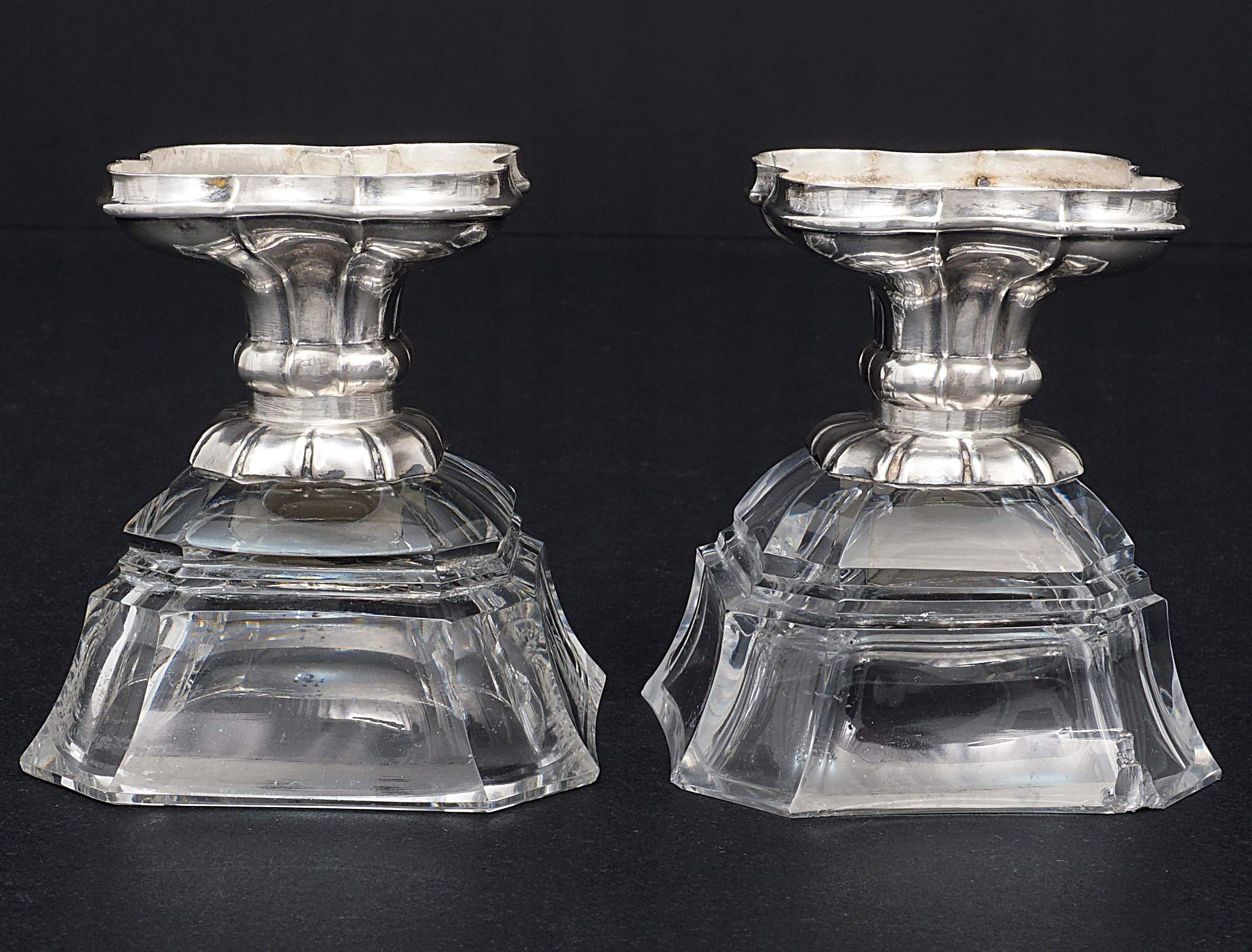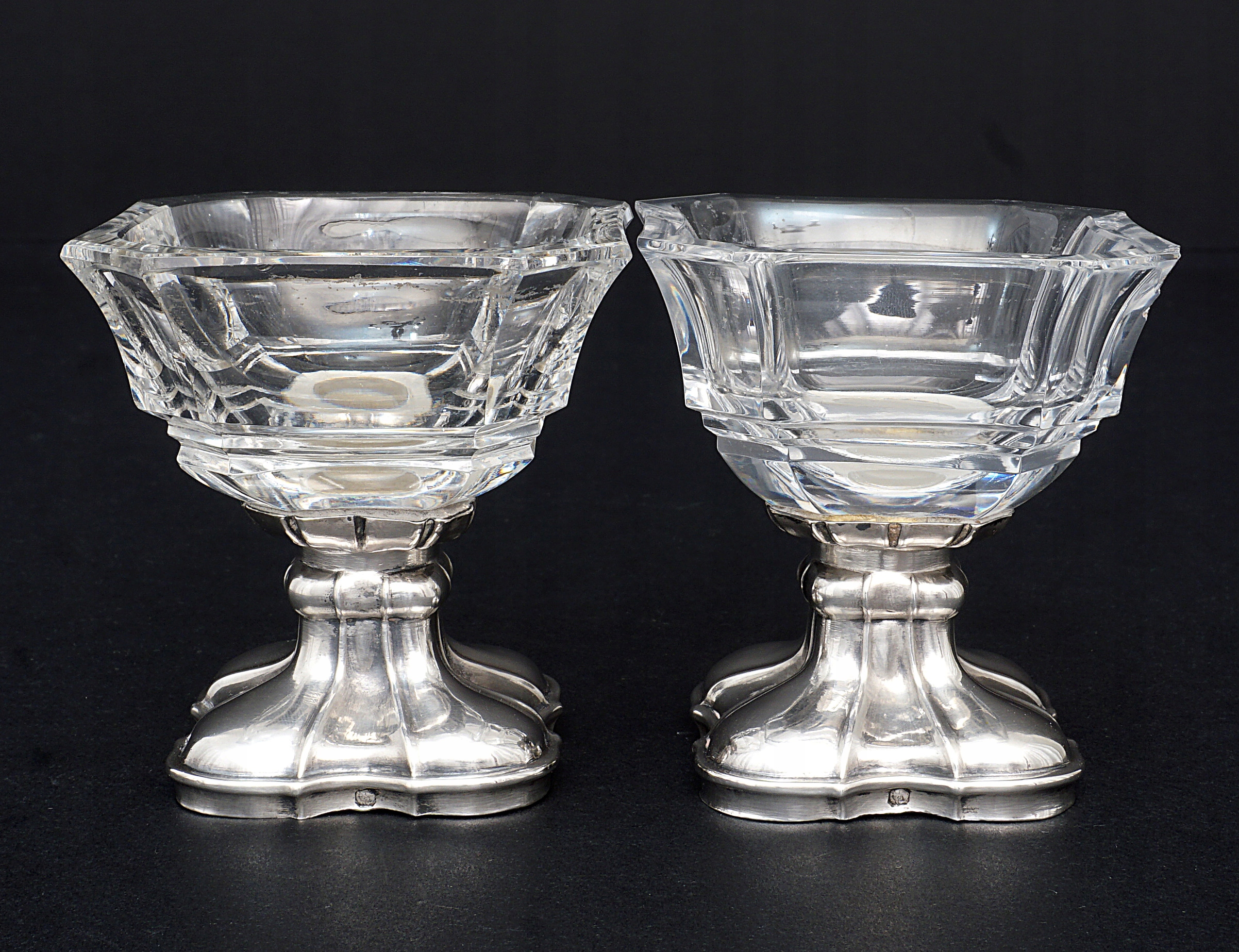 Солонки изготовлены из хрусталя ручной огранки и серебра 950/1000 пробы.