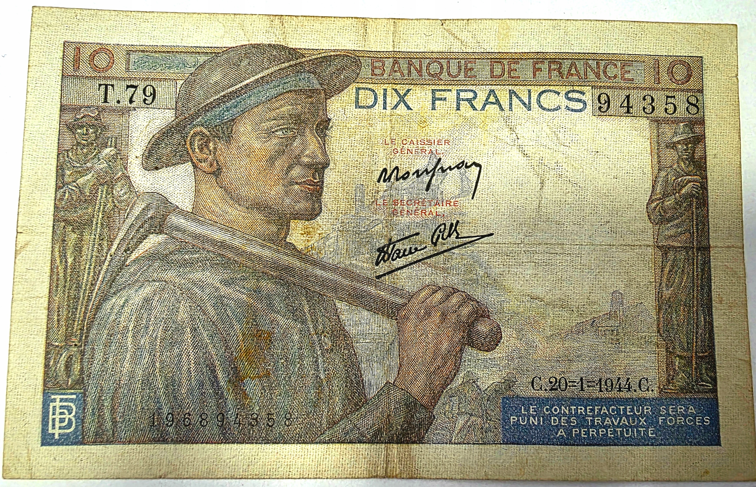 Франция 10 франков 1944 года - Banque de France - Фермер и мать с ребенком 851